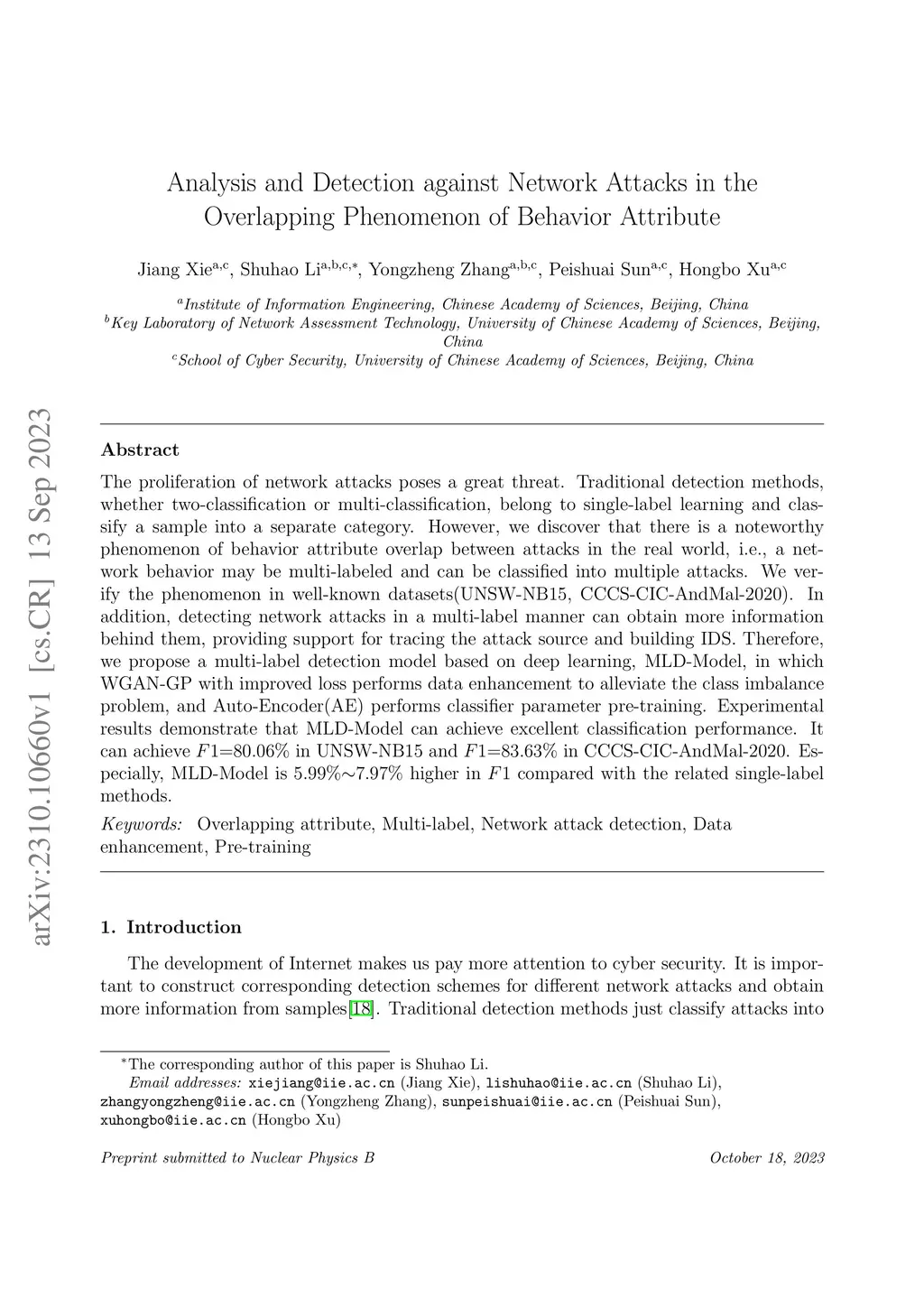The proliferation of network attacks poses a significant threat. Researchers propose datasets for network attacks to support research in related fields. Then, many attack detection methods based on these datasets are proposed. These detection methods, whether two-classification or multi-classification, belong to single-label learning, i.e., only one label is given to each sample. However, we discover that there is a noteworthy phenomenon of behavior attribute overlap between attacks, The presentation of this phenomenon in a dataset is that there are multiple samples with the same features but different labels. In this paper, we verify the phenomenon in well-known datasets(UNSW-NB15, CCCS-CIC-AndMal-2020) and re-label these data. In addition, detecting network attacks in a multi-label manner can obtain more information, providing support for tracing the attack source and building IDS. Therefore, we propose a multi-label detection model based on deep learning, MLD-Model, in which Wasserstein-Generative-Adversarial- Network-with-Gradient-Penalty (WGAN-GP) with improved loss performs data enhancement to alleviate the class imbalance problem, and Auto-Encoder (AE) performs classifier parameter pre-training. Experimental results demonstrate that MLD-Model can achieve excellent classification performance. It can achieve F1=80.06% in UNSW-NB15 and F1=83.63% in CCCS-CIC-AndMal-2020. Especially, MLD-Model is 5.99%-7.97% higher in F1 compared with the related single-label methods.