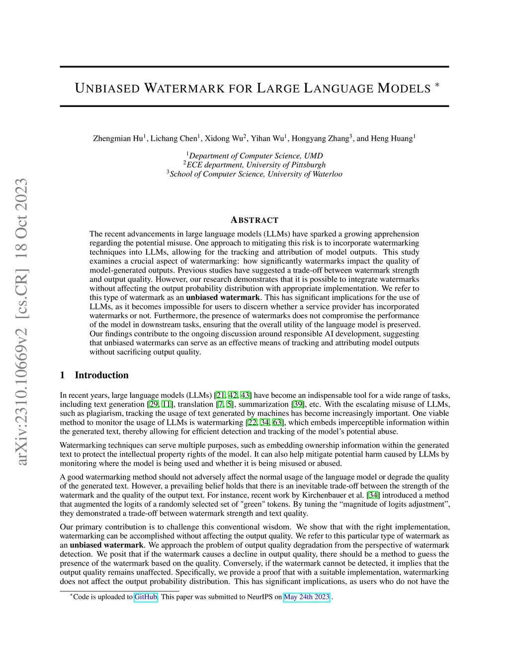 The recent advancements in large language models (LLMs) have sparked a growing apprehension regarding the potential misuse. One approach to mitigating this risk is to incorporate watermarking techniques into LLMs, allowing for the tracking and attribution of model outputs. This study examines a crucial aspect of watermarking: how significantly watermarks impact the quality of model-generated outputs. Previous studies have suggested a trade-off between watermark strength and output quality. However, our research demonstrates that it is possible to integrate watermarks without affecting the output probability distribution with appropriate implementation. We refer to this type of watermark as an unbiased watermark. This has significant implications for the use of LLMs, as it becomes impossible for users to discern whether a service provider has incorporated watermarks or not. Furthermore, the presence of watermarks does not compromise the performance of the model in downstream tasks, ensuring that the overall utility of the language model is preserved. Our findings contribute to the ongoing discussion around responsible AI development, suggesting that unbiased watermarks can serve as an effective means of tracking and attributing model outputs without sacrificing output quality.