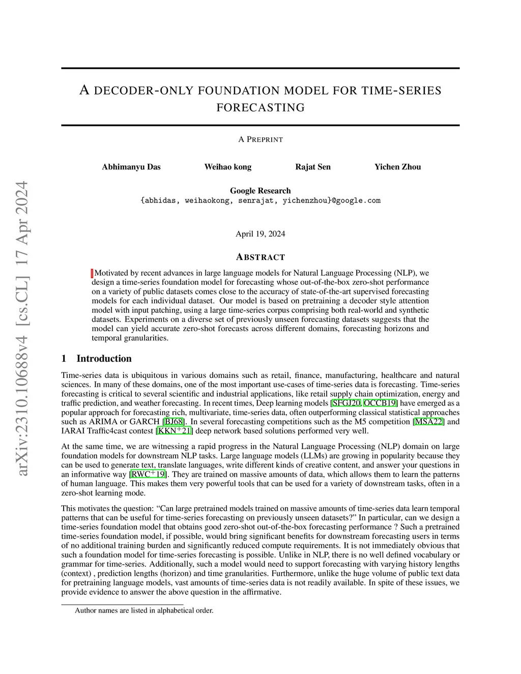 Motivated by recent advances in large language models for Natural Language Processing (NLP), we design a time-series foundation model for forecasting whose out-of-the-box zero-shot performance on a variety of public datasets comes close to the accuracy of state-of-the-art supervised forecasting models for each individual dataset. Our model is based on pretraining a patched-decoder style attention model on a large time-series corpus, and can work well across different forecasting history lengths, prediction lengths and temporal granularities.