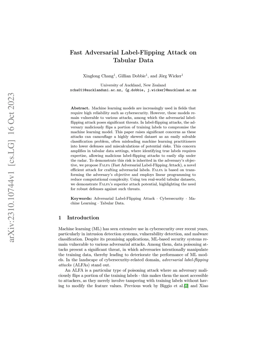 Machine learning models are increasingly used in fields that require high reliability such as cybersecurity. However, these models remain vulnerable to various attacks, among which the adversarial label-flipping attack poses significant threats. In label-flipping attacks, the adversary maliciously flips a portion of training labels to compromise the machine learning model. This paper raises significant concerns as these attacks can camouflage a highly skewed dataset as an easily solvable classification problem, often misleading machine learning practitioners into lower defenses and miscalculations of potential risks. This concern amplifies in tabular data settings, where identifying true labels requires expertise, allowing malicious label-flipping attacks to easily slip under the radar. To demonstrate this risk is inherited in the adversary's objective, we propose FALFA (Fast Adversarial Label-Flipping Attack), a novel efficient attack for crafting adversarial labels. FALFA is based on transforming the adversary's objective and employs linear programming to reduce computational complexity. Using ten real-world tabular datasets, we demonstrate FALFA's superior attack potential, highlighting the need for robust defenses against such threats.