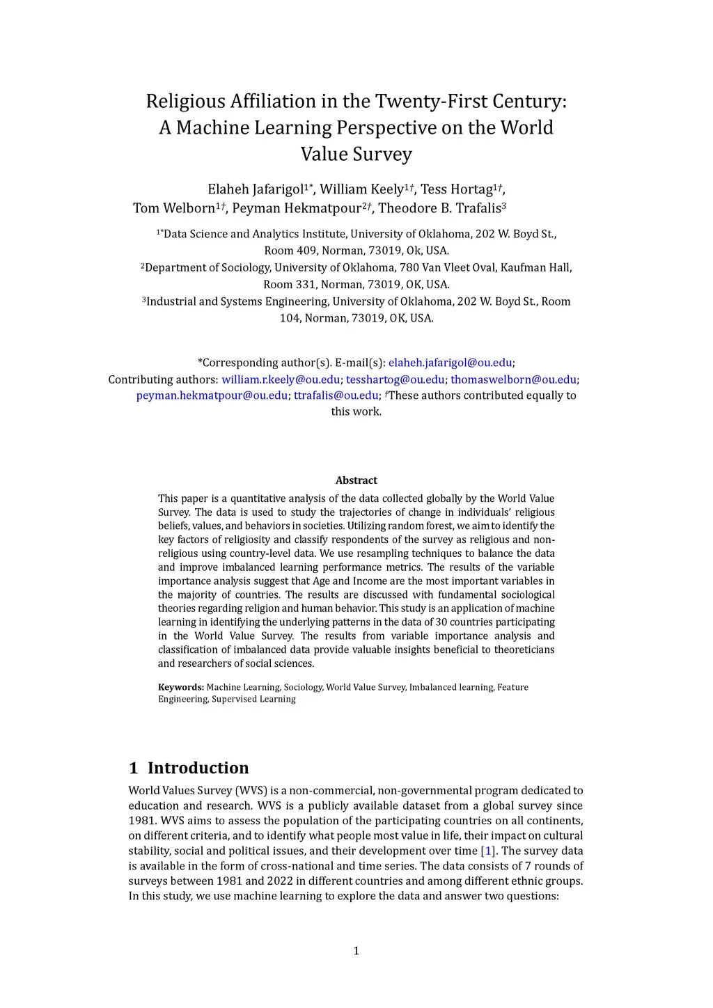 This paper is a quantitative analysis of the data collected globally by the World Value Survey. The data is used to study the trajectories of change in individuals' religious beliefs, values, and behaviors in societies. Utilizing random forest, we aim to identify the key factors of religiosity and classify respondents of the survey as religious and non religious using country level data. We use resampling techniques to balance the data and improve imbalanced learning performance metrics. The results of the variable importance analysis suggest that Age and Income are the most important variables in the majority of countries. The results are discussed with fundamental sociological theories regarding religion and human behavior. This study is an application of machine learning in identifying the underlying patterns in the data of 30 countries participating in the World Value Survey. The results from variable importance analysis and classification of imbalanced data provide valuable insights beneficial to theoreticians and researchers of social sciences.