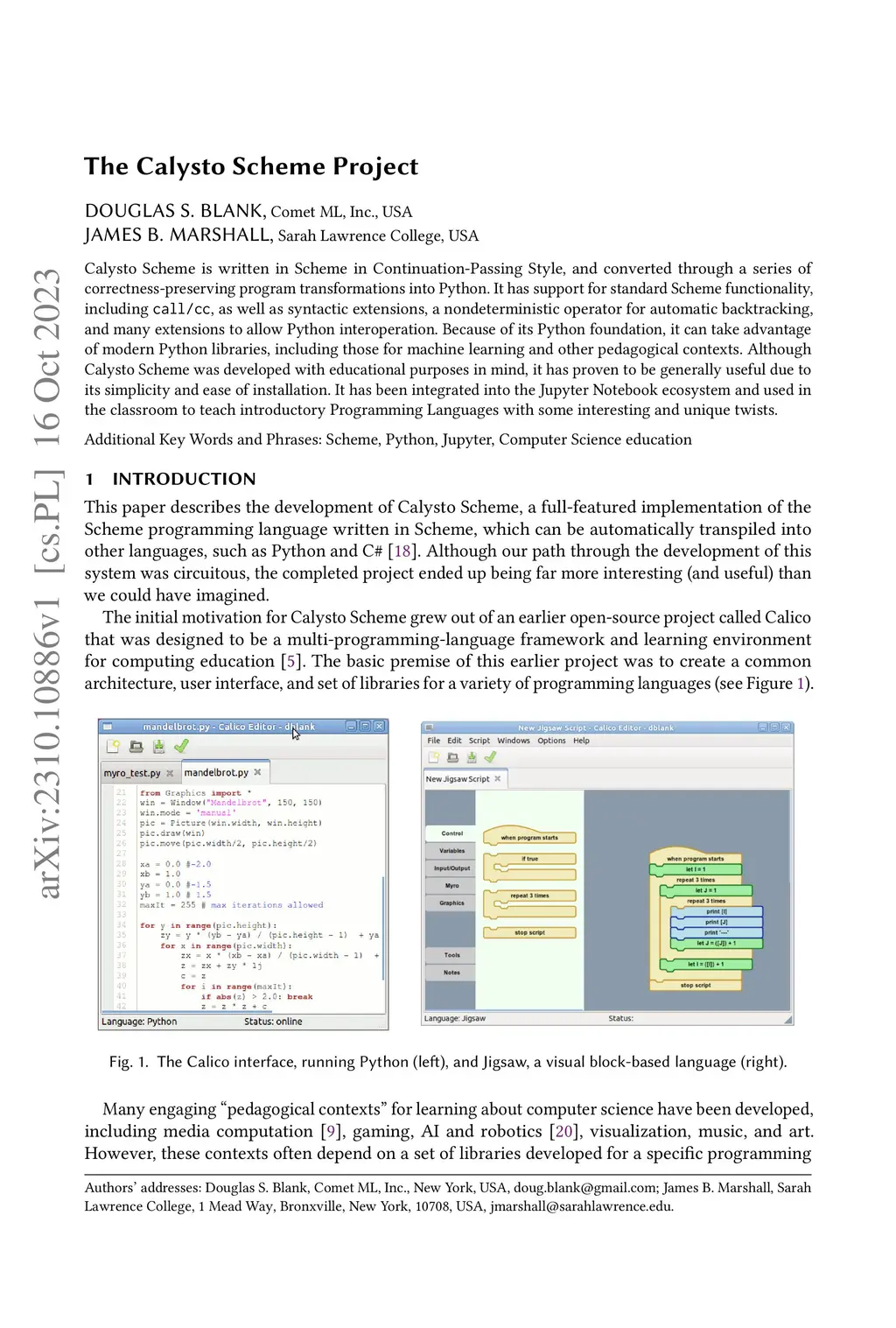 Calysto Scheme is written in Scheme in Continuation-Passing Style, and converted through a series of correctness-preserving program transformations into Python. It has support for standard Scheme functionality, including call/cc, as well as syntactic extensions, a nondeterministic operator for automatic backtracking, and many extensions to allow Python interoperation. Because of its Python foundation, it can take advantage of modern Python libraries, including those for machine learning and other pedagogical contexts. Although Calysto Scheme was developed with educational purposes in mind, it has proven to be generally useful due to its simplicity and ease of installation. It has been integrated into the Jupyter Notebook ecosystem and used in the classroom to teach introductory Programming Languages with some interesting and unique twists.