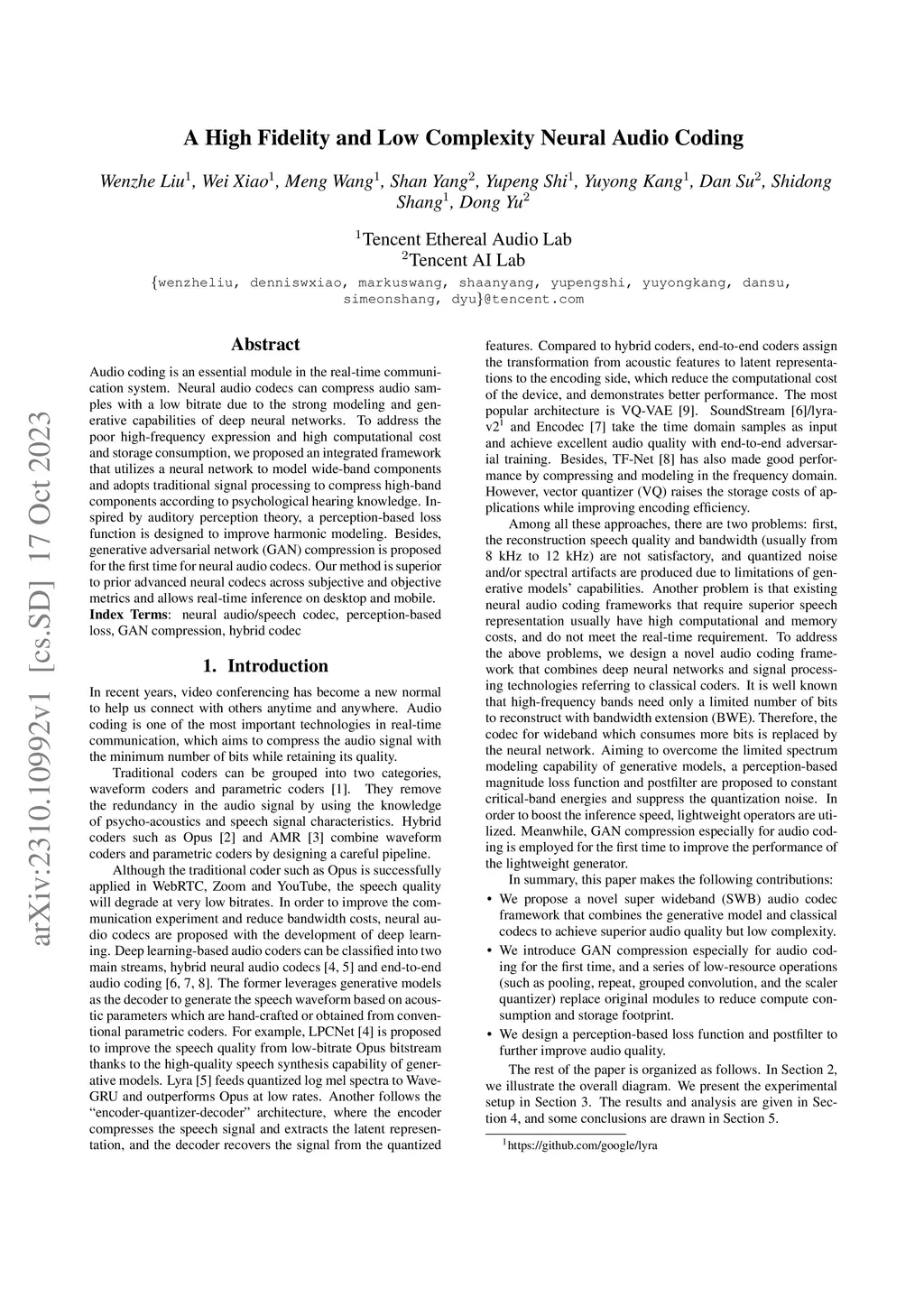 Audio coding is an essential module in the real-time communication system. Neural audio codecs can compress audio samples with a low bitrate due to the strong modeling and generative capabilities of deep neural networks. To address the poor high-frequency expression and high computational cost and storage consumption, we proposed an integrated framework that utilizes a neural network to model wide-band components and adopts traditional signal processing to compress high-band components according to psychological hearing knowledge. Inspired by auditory perception theory, a perception-based loss function is designed to improve harmonic modeling. Besides, generative adversarial network (GAN) compression is proposed for the first time for neural audio codecs. Our method is superior to prior advanced neural codecs across subjective and objective metrics and allows real-time inference on desktop and mobile.
