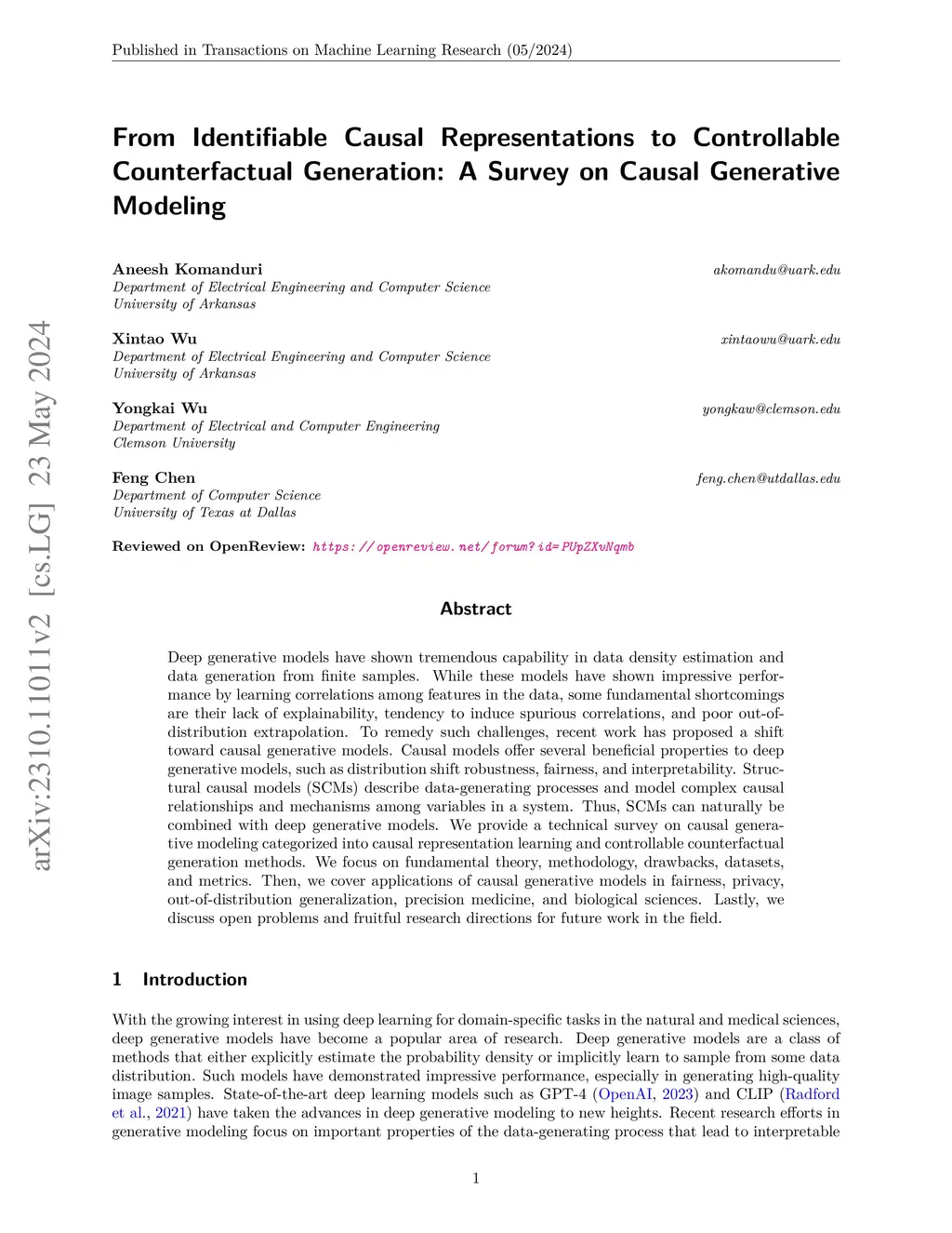 Deep generative models have shown tremendous capability in data density estimation and data generation from finite samples. While these models have shown impressive performance by learning correlations among features in the data, some fundamental shortcomings are their lack of explainability, tendency to induce spurious correlations, and poor out-of-distribution extrapolation. To remedy such challenges, recent work has proposed a shift toward causal generative models. Causal models offer several beneficial properties to deep generative models, such as distribution shift robustness, fairness, and interpretability. Structural causal models (SCMs) describe data-generating processes and model complex causal relationships and mechanisms among variables in a system. Thus, SCMs can naturally be combined with deep generative models. We provide a technical survey on causal generative modeling categorized into causal representation learning and controllable counterfactual generation methods. We focus on fundamental theory, methodology, drawbacks, datasets, and metrics. Then, we cover applications of causal generative models in fairness, privacy, out-of-distribution generalization, precision medicine, and biological sciences. Lastly, we discuss open problems and fruitful research directions for future work in the field.
