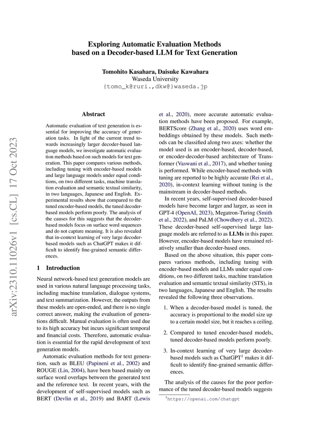 Automatic evaluation of text generation is essential for improving the accuracy of generation tasks. In light of the current trend towards increasingly larger decoder-based language models, we investigate automatic evaluation methods based on such models for text generation. This paper compares various methods, including tuning with encoder-based models and large language models under equal conditions, on two different tasks, machine translation evaluation and semantic textual similarity, in two languages, Japanese and English. Experimental results show that compared to the tuned encoder-based models, the tuned decoder-based models perform poorly. The analysis of the causes for this suggests that the decoder-based models focus on surface word sequences and do not capture meaning. It is also revealed that in-context learning of very large decoder-based models such as ChatGPT makes it difficult to identify fine-grained semantic differences.