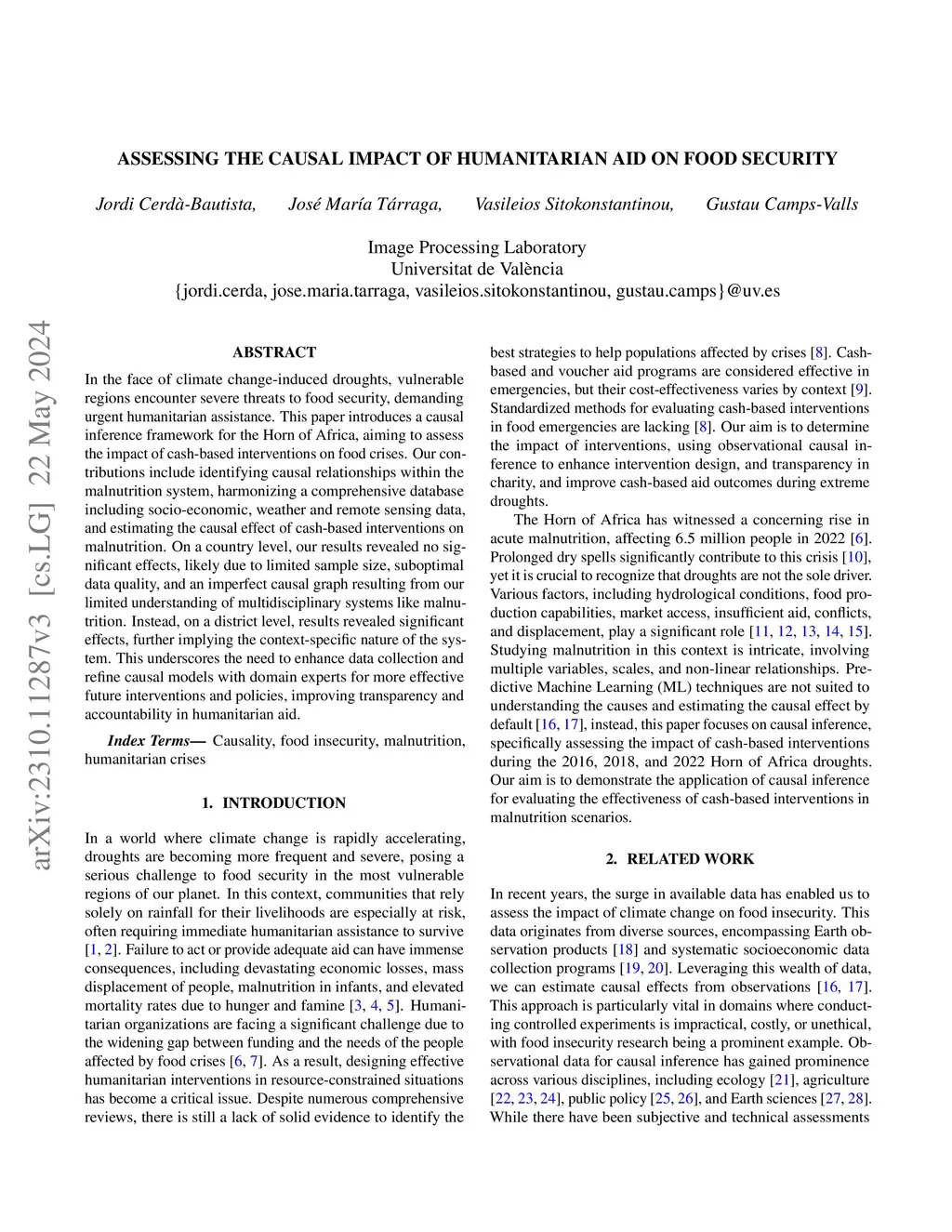 In the face of climate change-induced droughts, vulnerable regions encounter severe threats to food security, demanding urgent humanitarian assistance. This paper introduces a causal inference framework for the Horn of Africa, aiming to assess the impact of cash-based interventions on food crises. Our contributions include identifying causal relationships within the food security system, harmonizing a comprehensive database including socio-economic, weather and remote sensing data, and estimating the causal effect of humanitarian interventions on malnutrition. On a country level, our results revealed no significant effects, likely due to limited sample size, suboptimal data quality, and an imperfect causal graph resulting from our limited understanding of multidisciplinary systems like food security. Instead, on a district level, results revealed significant effects, further implying the context-specific nature of the system. This underscores the need to enhance data collection and refine causal models with domain experts for more effective future interventions and policies, improving transparency and accountability in humanitarian aid.