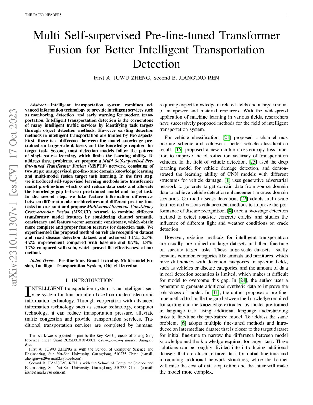 Intelligent transportation system combines advanced information technology to provide intelligent services such as monitoring, detection, and early warning for modern transportation. Intelligent transportation detection is the cornerstone of many intelligent traffic services by identifying task targets through object detection methods. However existing detection methods in intelligent transportation are limited by two aspects. First, there is a difference between the model knowledge pre-trained on large-scale datasets and the knowledge required for target task. Second, most detection models follow the pattern of single-source learning, which limits the learning ability. To address these problems, we propose a Multi Self-supervised Pre-fine-tuned Transformer Fusion (MSPTF) network, consisting of two steps: unsupervised pre-fine-tune domain knowledge learning and multi-model fusion target task learning. In the first step, we introduced self-supervised learning methods into transformer model pre-fine-tune which could reduce data costs and alleviate the knowledge gap between pre-trained model and target task. In the second step, we take feature information differences between different model architectures and different pre-fine-tune tasks into account and propose Multi-model Semantic Consistency Cross-attention Fusion (MSCCF) network to combine different transformer model features by considering channel semantic consistency and feature vector semantic consistency, which obtain more complete and proper fusion features for detection task. We experimented the proposed method on vehicle recognition dataset and road disease detection dataset and achieved 1.1%, 5.5%, 4.2% improvement compared with baseline and 0.7%, 1.8%, 1.7% compared with sota, which proved the effectiveness of our method.