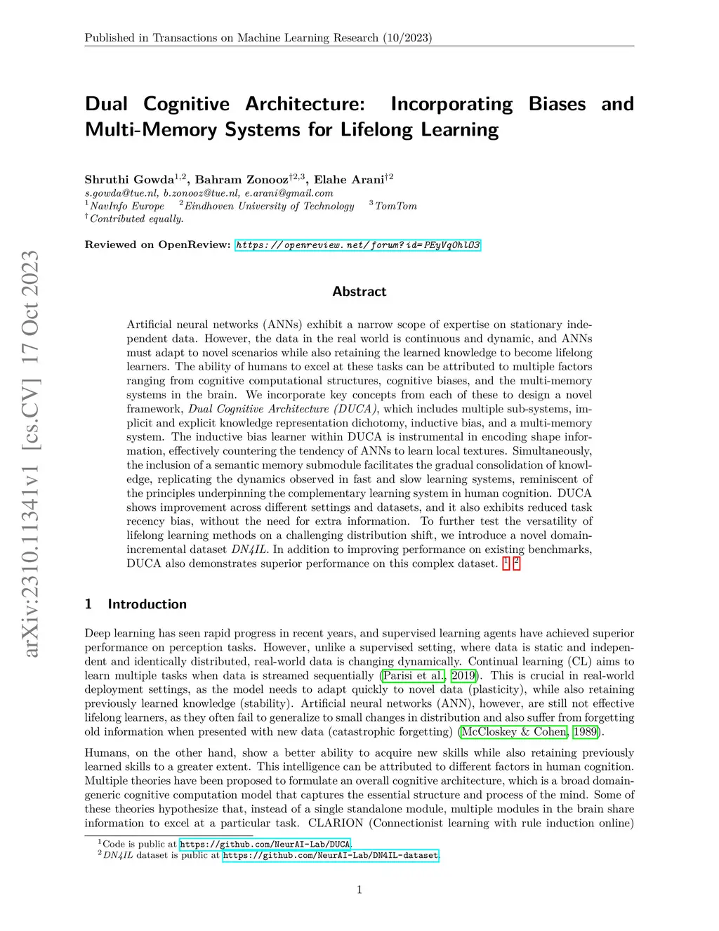 Artificial neural networks (ANNs) exhibit a narrow scope of expertise on stationary independent data. However, the data in the real world is continuous and dynamic, and ANNs must adapt to novel scenarios while also retaining the learned knowledge to become lifelong learners. The ability of humans to excel at these tasks can be attributed to multiple factors ranging from cognitive computational structures, cognitive biases, and the multi-memory systems in the brain. We incorporate key concepts from each of these to design a novel framework, Dual Cognitive Architecture (DUCA), which includes multiple sub-systems, implicit and explicit knowledge representation dichotomy, inductive bias, and a multi-memory system. The inductive bias learner within DUCA is instrumental in encoding shape information, effectively countering the tendency of ANNs to learn local textures. Simultaneously, the inclusion of a semantic memory submodule facilitates the gradual consolidation of knowledge, replicating the dynamics observed in fast and slow learning systems, reminiscent of the principles underpinning the complementary learning system in human cognition. DUCA shows improvement across different settings and datasets, and it also exhibits reduced task recency bias, without the need for extra information. To further test the versatility of lifelong learning methods on a challenging distribution shift, we introduce a novel domain-incremental dataset DN4IL. In addition to improving performance on existing benchmarks, DUCA also demonstrates superior performance on this complex dataset.