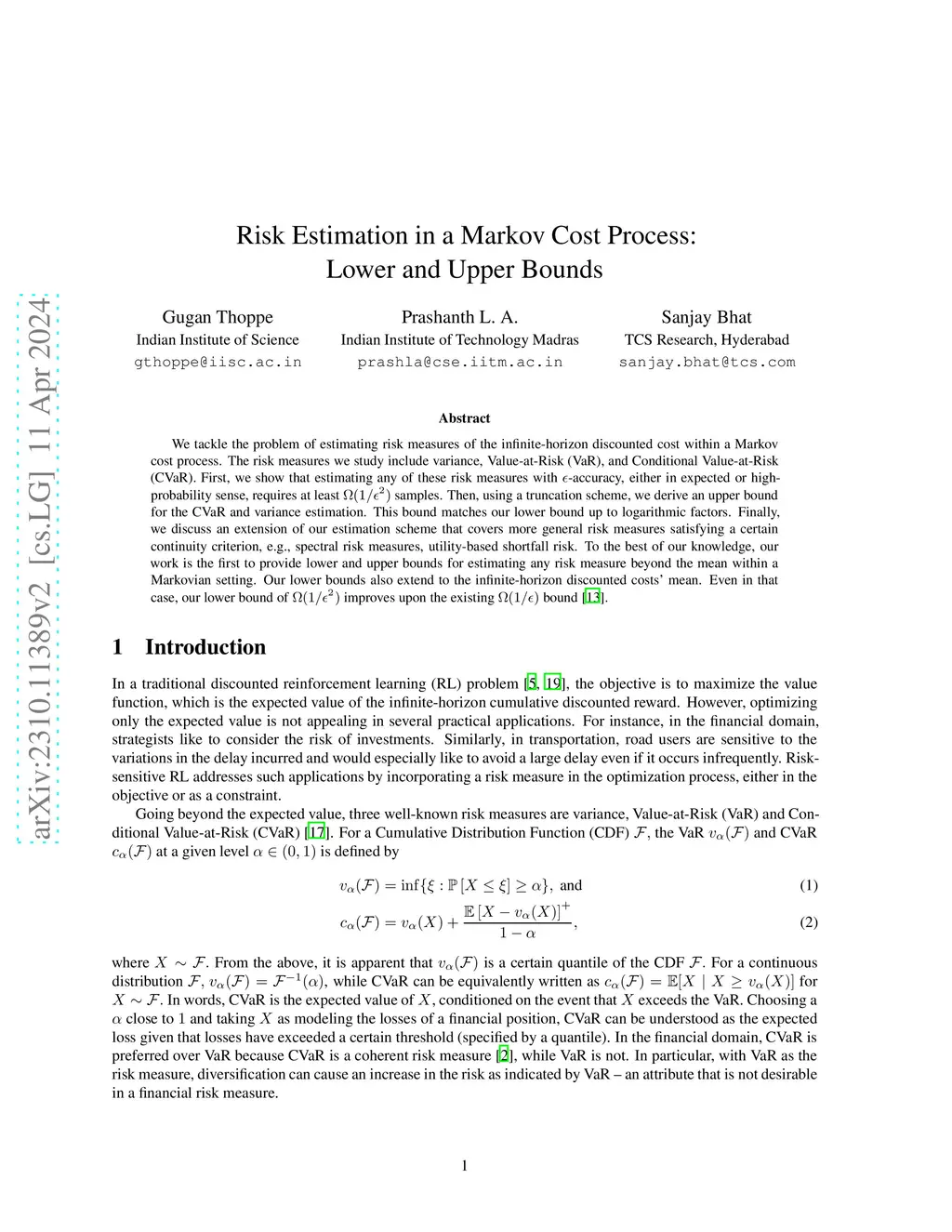 We tackle the problem of estimating risk measures of the infinite-horizon discounted cost within a Markov cost process. The risk measures we study include variance, Value-at-Risk (VaR), and Conditional Value-at-Risk (CVaR). First, we show that estimating any of these risk measures with -accuracy, either in expected or high-probability sense, requires at least samples. Then, using a truncation scheme, we derive an upper bound for the CVaR and variance estimation. This bound matches our lower bound up to logarithmic factors. Finally, we discuss an extension of our estimation scheme that covers more general risk measures satisfying a certain continuity criterion, e.g., spectral risk measures, utility-based shortfall risk. To the best of our knowledge, our work is the first to provide lower and upper bounds for estimating any risk measure beyond the mean within a Markovian setting. Our lower bounds also extend to the infinite-horizon discounted costs' mean. Even in that case, our lower bound of $\Omega(1/\epsilon^2) $ improves upon the existing bound [13].