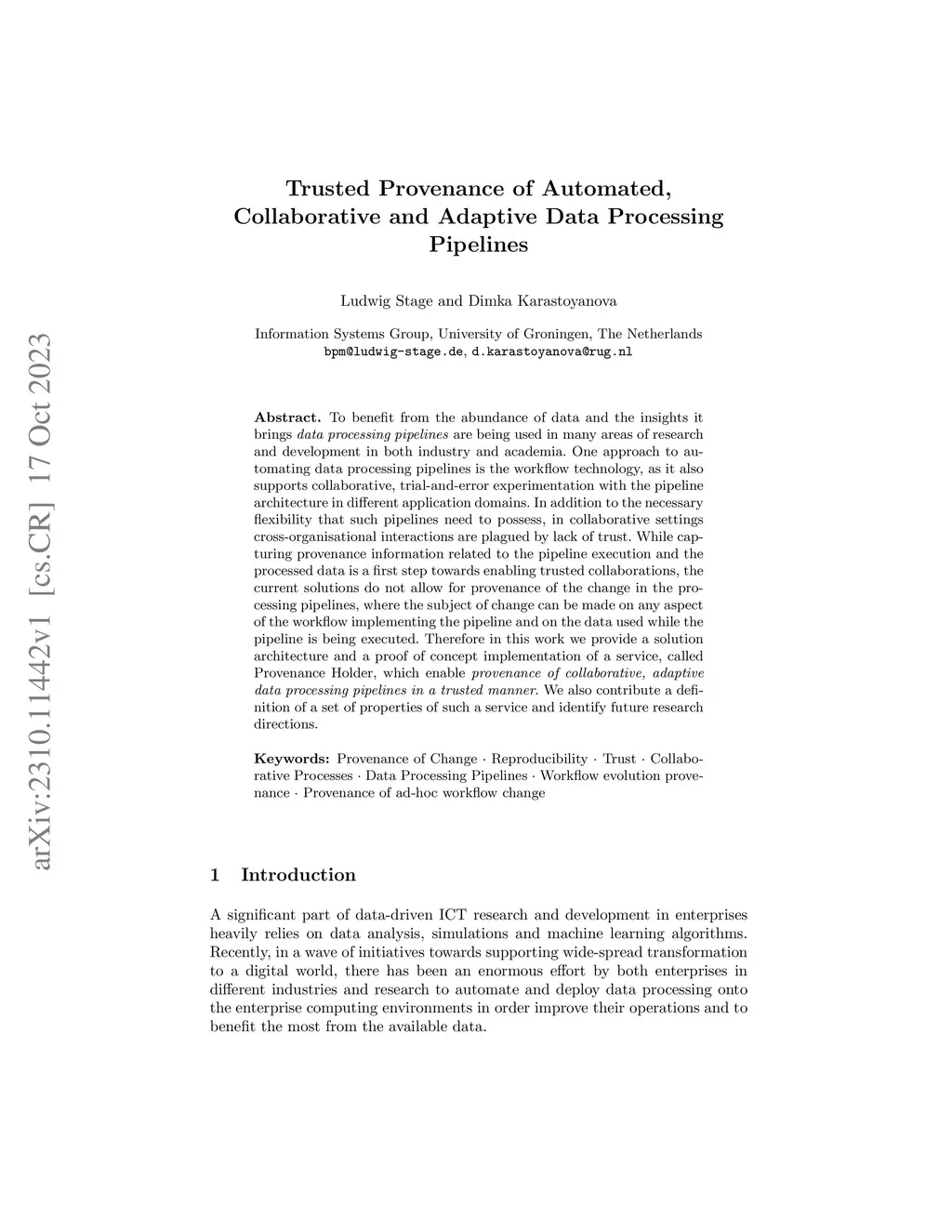 To benefit from the abundance of data and the insights it brings data processing pipelines are being used in many areas of research and development in both industry and academia. One approach to automating data processing pipelines is the workflow technology, as it also supports collaborative, trial-and-error experimentation with the pipeline architecture in different application domains. In addition to the necessary flexibility that such pipelines need to possess, in collaborative settings cross-organisational interactions are plagued by lack of trust. While capturing provenance information related to the pipeline execution and the processed data is a first step towards enabling trusted collaborations, the current solutions do not allow for provenance of the change in the processing pipelines, where the subject of change can be made on any aspect of the workflow implementing the pipeline and on the data used while the pipeline is being executed. Therefore in this work we provide a solution architecture and a proof of concept implementation of a service, called Provenance Holder, which enable provenance of collaborative, adaptive data processing pipelines in a trusted manner. We also contribute a definition of a set of properties of such a service and identify future research directions.