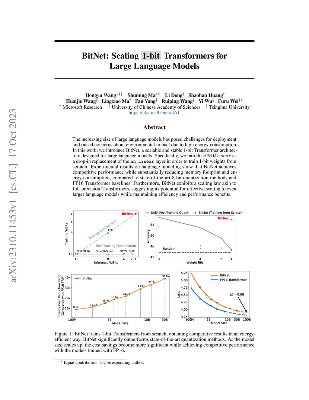 BitNet: Scaling 1-bit Transformers for Large Language Models
