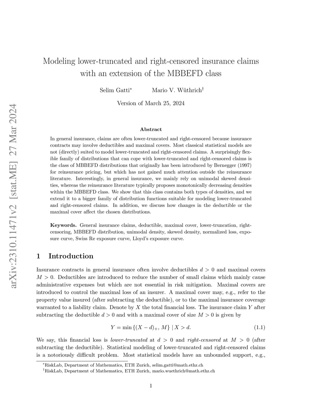 In general insurance, claims are often lower-truncated and right-censored because insurance contracts may involve deductibles and maximal covers. Most classical statistical models are not (directly) suited to model lower-truncated and right-censored claims. A surprisingly flexible family of distributions that can cope with lower-truncated and right-censored claims is the class of MBBEFD distributions that originally has been introduced by Bernegger (1997) for reinsurance pricing, but which has not gained much attention outside the reinsurance literature. Interestingly, in general insurance, we mainly rely on unimodal skewed densities, whereas the reinsurance literature typically proposes monotonically decreasing densities within the MBBEFD class. We show that this class contains both types of densities, and we extend it to a bigger family of distribution functions suitable for modeling lower-truncated and right-censored claims. In addition, we discuss how changes in the deductible or the maximal cover affect the chosen distributions.