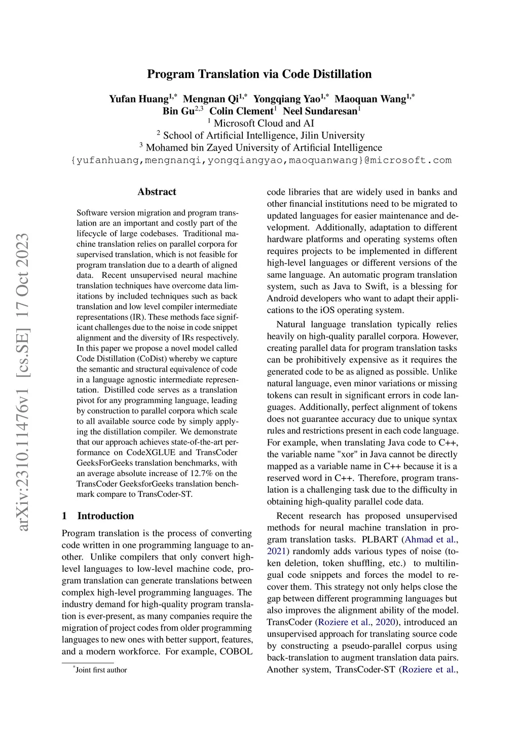 Software version migration and program translation are an important and costly part of the lifecycle of large codebases. Traditional machine translation relies on parallel corpora for supervised translation, which is not feasible for program translation due to a dearth of aligned data. Recent unsupervised neural machine translation techniques have overcome data limitations by included techniques such as back translation and low level compiler intermediate representations (IR). These methods face significant challenges due to the noise in code snippet alignment and the diversity of IRs respectively. In this paper we propose a novel model called Code Distillation (CoDist) whereby we capture the semantic and structural equivalence of code in a language agnostic intermediate representation. Distilled code serves as a translation pivot for any programming language, leading by construction to parallel corpora which scale to all available source code by simply applying the distillation compiler. We demonstrate that our approach achieves state-of-the-art performance on CodeXGLUE and TransCoder GeeksForGeeks translation benchmarks, with an average absolute increase of 12.7% on the TransCoder GeeksforGeeks translation benchmark compare to TransCoder-ST.
