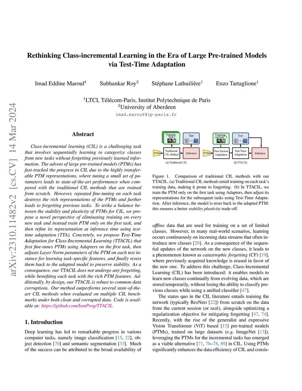 Class-incremental learning (CIL) is a challenging task that involves sequentially learning to categorize classes from new tasks without forgetting previously learned information. The advent of large pre-trained models (PTMs) has fast-tracked the progress in CIL due to the highly transferable PTM representations, where tuning a small set of parameters leads to state-of-the-art performance when compared with the traditional CIL methods that are trained from scratch. However, repeated fine-tuning on each task destroys the rich representations of the PTMs and further leads to forgetting previous tasks. To strike a balance between the stability and plasticity of PTMs for CIL, we propose a novel perspective of eliminating training on every new task and instead train PTM only on the first task, and then refine its representation at inference time using test-time adaptation (TTA). Concretely, we propose Test-Time Adaptation for Class-Incremental Learning (TTACIL) that first fine-tunes PTMs using Adapters on the first task, then adjusts Layer Norm parameters of the PTM on each test instance for learning task-specific features, and finally resets them back to the adapted model to preserve stability. As a consequence, our TTACIL does not undergo any forgetting, while benefiting each task with the rich PTM features. Additionally, by design, our TTACIL is robust to common data corruptions. Our method outperforms several state-of-the-art CIL methods when evaluated on multiple CIL benchmarks under both clean and corrupted data. Code is available at: https://github.com/IemProg/TTACIL.