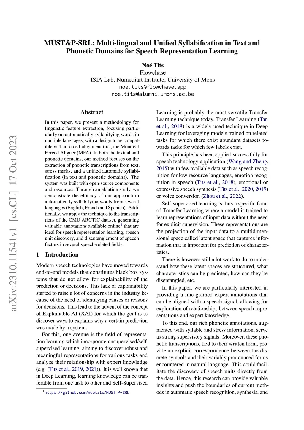 In this paper, we present a methodology for linguistic feature extraction, focusing particularly on automatically syllabifying words in multiple languages, with a design to be compatible with a forced-alignment tool, the Montreal Forced Aligner (MFA). In both the textual and phonetic domains, our method focuses on the extraction of phonetic transcriptions from text, stress marks, and a unified automatic syllabification (in text and phonetic domains). The system was built with open-source components and resources. Through an ablation study, we demonstrate the efficacy of our approach in automatically syllabifying words from several languages (English, French and Spanish). Additionally, we apply the technique to the transcriptions of the CMU ARCTIC dataset, generating valuable annotations available online\footnote{\url{https://github.com/noetits/MUST_P-SRL}} that are ideal for speech representation learning, speech unit discovery, and disentanglement of speech factors in several speech-related fields.
