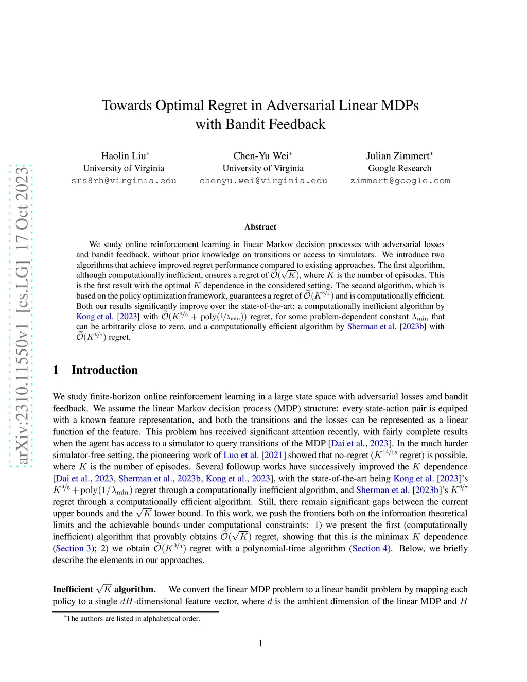 We study online reinforcement learning in linear Markov decision processes with adversarial losses and bandit feedback, without prior knowledge on transitions or access to simulators. We introduce two algorithms that achieve improved regret performance compared to existing approaches. The first algorithm, although computationally inefficient, ensures a regret of , where is the number of episodes. This is the first result with the optimal dependence in the considered setting. The second algorithm, which is based on the policy optimization framework, guarantees a regret of and is computationally efficient. Both our results significantly improve over the state-of-the-art: a computationally inefficient algorithm by Kong et al. [2023] with regret, for some problem-dependent constant that can be arbitrarily close to zero, and a computationally efficient algorithm by Sherman et al. [2023b] with regret.