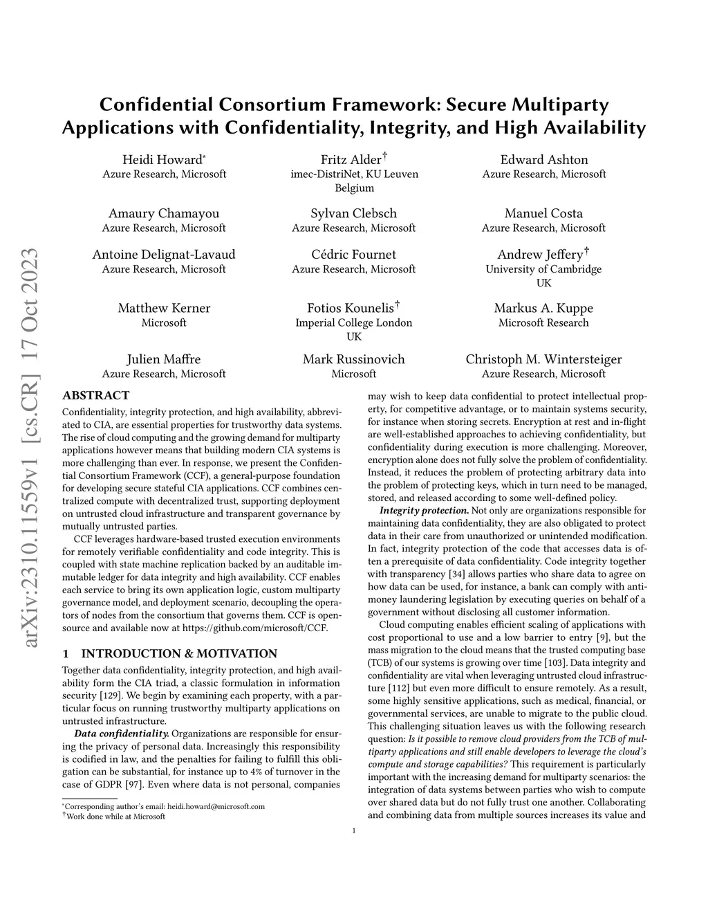 Confidentiality, integrity protection, and high availability, abbreviated to CIA, are essential properties for trustworthy data systems. The rise of cloud computing and the growing demand for multiparty applications however means that building modern CIA systems is more challenging than ever. In response, we present the Confidential Consortium Framework (CCF), a general-purpose foundation for developing secure stateful CIA applications. CCF combines centralized compute with decentralized trust, supporting deployment on untrusted cloud infrastructure and transparent governance by mutually untrusted parties. CCF leverages hardware-based trusted execution environments for remotely verifiable confidentiality and code integrity. This is coupled with state machine replication backed by an auditable immutable ledger for data integrity and high availability. CCF enables each service to bring its own application logic, custom multiparty governance model, and deployment scenario, decoupling the operators of nodes from the consortium that governs them. CCF is open-source and available now at https://github.com/microsoft/CCF.