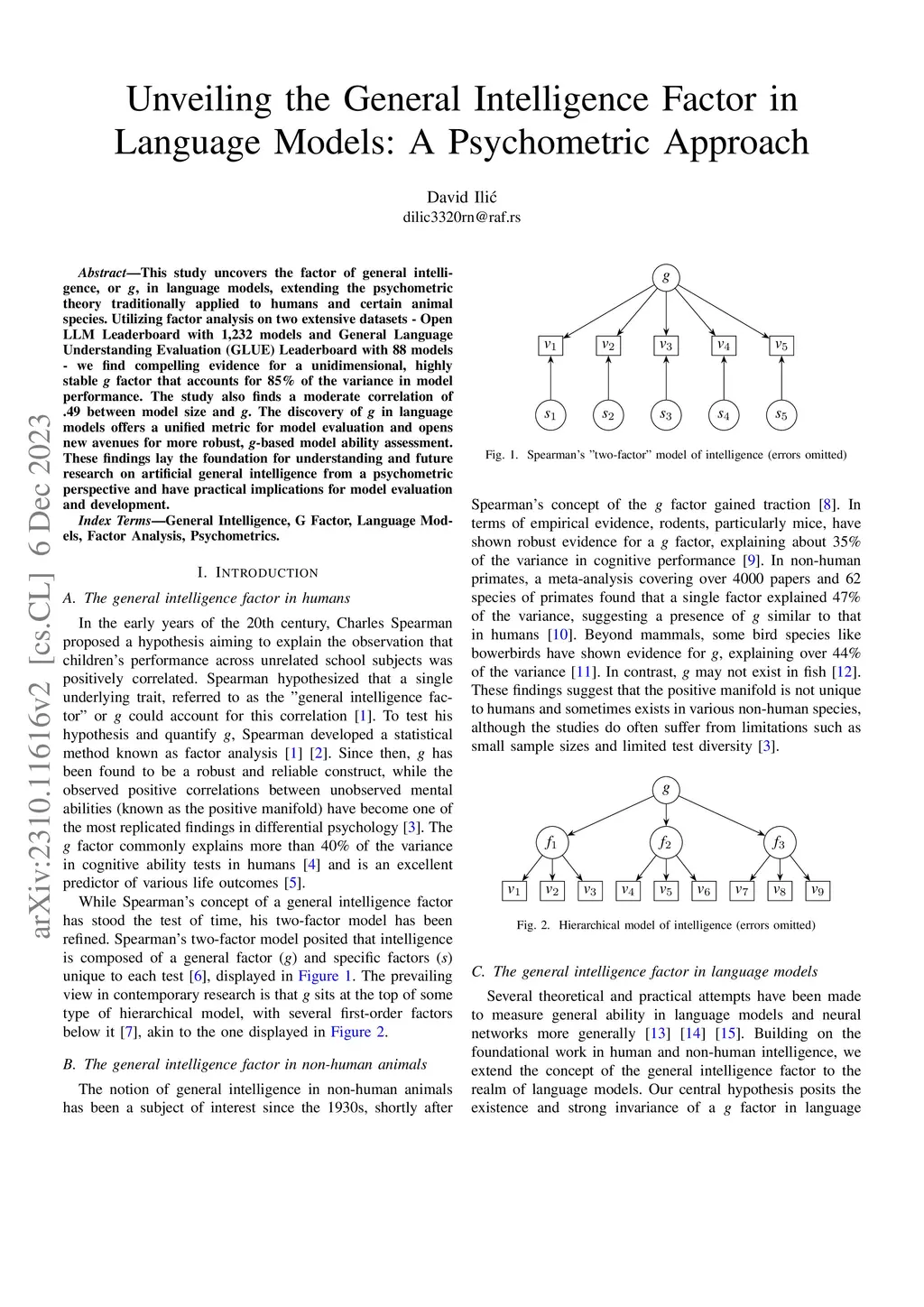 This study uncovers the factor of general intelligence, or g, in language models, extending the psychometric theory traditionally applied to humans and certain animal species. Utilizing factor analysis on two extensive datasets - Open LLM Leaderboard with 1,232 models and General Language Understanding Evaluation (GLUE) Leaderboard with 88 models - we find compelling evidence for a unidimensional, highly stable g factor that accounts for 85% of the variance in model performance. The study also finds a moderate correlation of .49 between model size and g. The discovery of g in language models offers a unified metric for model evaluation and opens new avenues for more robust, g-based model ability assessment. These findings lay the foundation for understanding and future research on artificial general intelligence from a psychometric perspective and have practical implications for model evaluation and development.