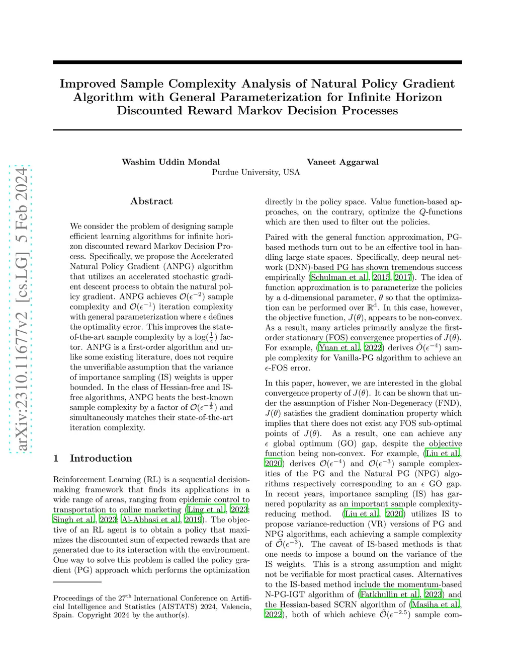 We consider the problem of designing sample efficient learning algorithms for infinite horizon discounted reward Markov Decision Process. Specifically, we propose the Accelerated Natural Policy Gradient (ANPG) algorithm that utilizes an accelerated stochastic gradient descent process to obtain the natural policy gradient. ANPG achieves sample complexity and iteration complexity with general parameterization where defines the optimality error. This improves the state-of-the-art sample complexity by a factor. ANPG is a first-order algorithm and unlike some existing literature, does not require the unverifiable assumption that the variance of importance sampling (IS) weights is upper bounded. In the class of Hessian-free and IS-free algorithms, ANPG beats the best-known sample complexity by a factor of and simultaneously matches their state-of-the-art iteration complexity.