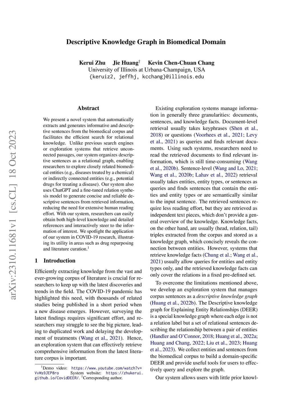 We present a novel system that automatically extracts and generates informative and descriptive sentences from the biomedical corpus and facilitates the efficient search for relational knowledge. Unlike previous search engines or exploration systems that retrieve unconnected passages, our system organizes descriptive sentences as a relational graph, enabling researchers to explore closely related biomedical entities (e.g., diseases treated by a chemical) or indirectly connected entities (e.g., potential drugs for treating a disease). Our system also uses ChatGPT and a fine-tuned relation synthesis model to generate concise and reliable descriptive sentences from retrieved information, reducing the need for extensive human reading effort. With our system, researchers can easily obtain both high-level knowledge and detailed references and interactively steer to the information of interest. We spotlight the application of our system in COVID-19 research, illustrating its utility in areas such as drug repurposing and literature curation.