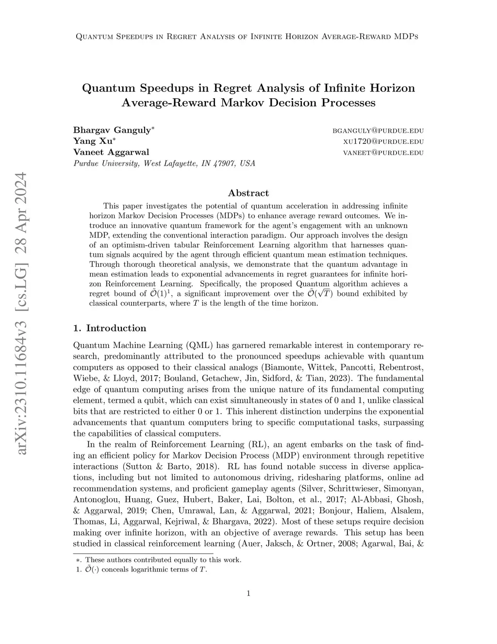 This paper investigates the potential of quantum acceleration in addressing infinite horizon Markov Decision Processes (MDPs) to enhance average reward outcomes. We introduce an innovative quantum framework for the agent's engagement with an unknown MDP, extending the conventional interaction paradigm. Our approach involves the design of an optimism-driven tabular Reinforcement Learning algorithm that harnesses quantum signals acquired by the agent through efficient quantum mean estimation techniques. Through thorough theoretical analysis, we demonstrate that the quantum advantage in mean estimation leads to exponential advancements in regret guarantees for infinite horizon Reinforcement Learning. Specifically, the proposed Quantum algorithm achieves a regret bound of , a significant improvement over the bound exhibited by classical counterparts.