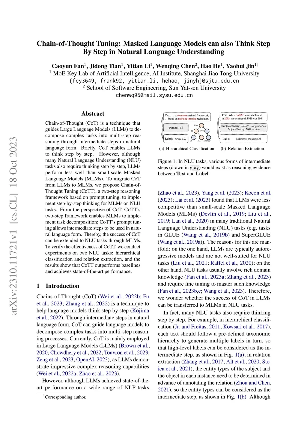 Chain-of-Thought (CoT) is a technique that guides Large Language Models (LLMs) to decompose complex tasks into multi-step reasoning through intermediate steps in natural language form. Briefly, CoT enables LLMs to think step by step. However, although many Natural Language Understanding (NLU) tasks also require thinking step by step, LLMs perform less well than small-scale Masked Language Models (MLMs). To migrate CoT from LLMs to MLMs, we propose Chain-of-Thought Tuning (CoTT), a two-step reasoning framework based on prompt tuning, to implement step-by-step thinking for MLMs on NLU tasks. From the perspective of CoT, CoTT's two-step framework enables MLMs to implement task decomposition; CoTT's prompt tuning allows intermediate steps to be used in natural language form. Thereby, the success of CoT can be extended to NLU tasks through MLMs. To verify the effectiveness of CoTT, we conduct experiments on two NLU tasks: hierarchical classification and relation extraction, and the results show that CoTT outperforms baselines and achieves state-of-the-art performance.
