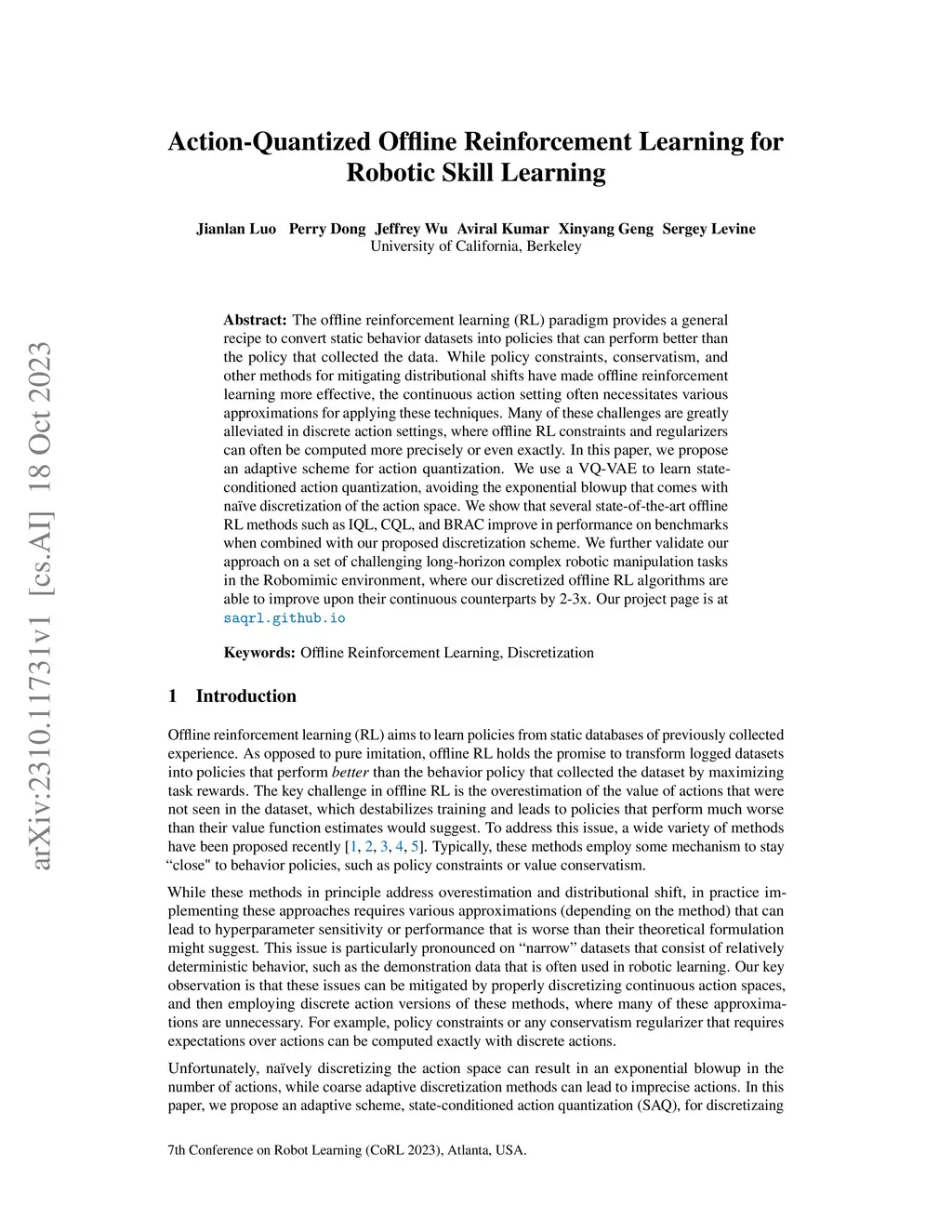 The offline reinforcement learning (RL) paradigm provides a general recipe to convert static behavior datasets into policies that can perform better than the policy that collected the data. While policy constraints, conservatism, and other methods for mitigating distributional shifts have made offline reinforcement learning more effective, the continuous action setting often necessitates various approximations for applying these techniques. Many of these challenges are greatly alleviated in discrete action settings, where offline RL constraints and regularizers can often be computed more precisely or even exactly. In this paper, we propose an adaptive scheme for action quantization. We use a VQ-VAE to learn state-conditioned action quantization, avoiding the exponential blowup that comes with na\"ive discretization of the action space. We show that several state-of-the-art offline RL methods such as IQL, CQL, and BRAC improve in performance on benchmarks when combined with our proposed discretization scheme. We further validate our approach on a set of challenging long-horizon complex robotic manipulation tasks in the Robomimic environment, where our discretized offline RL algorithms are able to improve upon their continuous counterparts by 2-3x. Our project page is at https://saqrl.github.io/