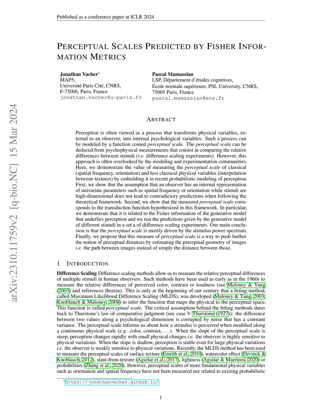 Perception is often viewed as a process that transforms physical variables, external to an observer, into internal psychological variables. Such a process can be modeled by a function coined perceptual scale. The perceptual scale can be deduced from psychophysical measurements that consist in comparing the relative differences between stimuli (i.e. difference scaling experiments). However, this approach is often overlooked by the modeling and experimentation communities. Here, we demonstrate the value of measuring the perceptual scale of classical (spatial frequency, orientation) and less classical physical variables (interpolation between textures) by embedding it in recent probabilistic modeling of perception. First, we show that the assumption that an observer has an internal representation of univariate parameters such as spatial frequency or orientation while stimuli are high-dimensional does not lead to contradictory predictions when following the theoretical framework. Second, we show that the measured perceptual scale corresponds to the transduction function hypothesized in this framework. In particular, we demonstrate that it is related to the Fisher information of the generative model that underlies perception and we test the predictions given by the generative model of different stimuli in a set a of difference scaling experiments. Our main conclusion is that the perceptual scale is mostly driven by the stimulus power spectrum. Finally, we propose that this measure of perceptual scale is a way to push further the notion of perceptual distances by estimating the perceptual geometry of images i.e. the path between images instead of simply the distance between those.