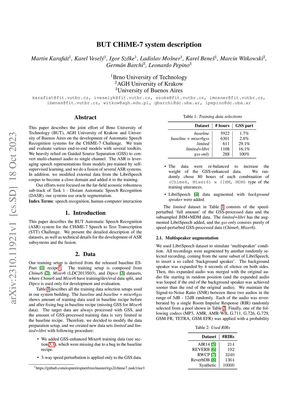 This paper describes the joint effort of Brno University of Technology (BUT), AGH University of Krakow and University of Buenos Aires on the development of Automatic Speech Recognition systems for the CHiME-7 Challenge. We train and evaluate various end-to-end models with several toolkits. We heavily relied on Guided Source Separation (GSS) to convert multi-channel audio to single channel. The ASR is leveraging speech representations from models pre-trained by self-supervised learning, and we do a fusion of several ASR systems. In addition, we modified external data from the LibriSpeech corpus to become a close domain and added it to the training. Our efforts were focused on the far-field acoustic robustness sub-track of Task 1 - Distant Automatic Speech Recognition (DASR), our systems use oracle segmentation.