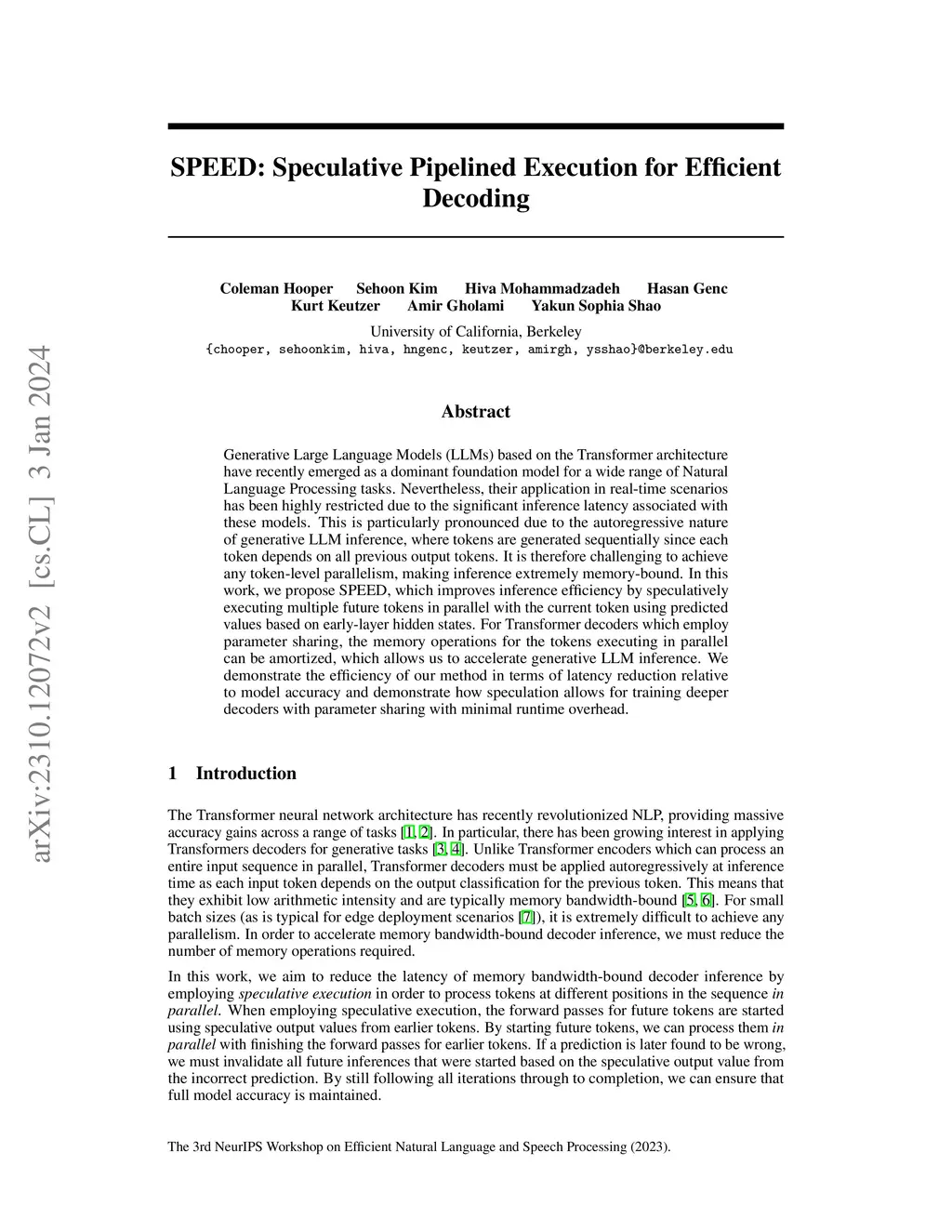 Generative Large Language Models (LLMs) based on the Transformer architecture have recently emerged as a dominant foundation model for a wide range of Natural Language Processing tasks. Nevertheless, their application in real-time scenarios has been highly restricted due to the significant inference latency associated with these models. This is particularly pronounced due to the autoregressive nature of generative LLM inference, where tokens are generated sequentially since each token depends on all previous output tokens. It is therefore challenging to achieve any token-level parallelism, making inference extremely memory-bound. In this work, we propose SPEED, which improves inference efficiency by speculatively executing multiple future tokens in parallel with the current token using predicted values based on early-layer hidden states. For Transformer decoders that employ parameter sharing, the memory operations for the tokens executing in parallel can be amortized, which allows us to accelerate generative LLM inference. We demonstrate the efficiency of our method in terms of latency reduction relative to model accuracy and demonstrate how speculation allows for training deeper decoders with parameter sharing with minimal runtime overhead.