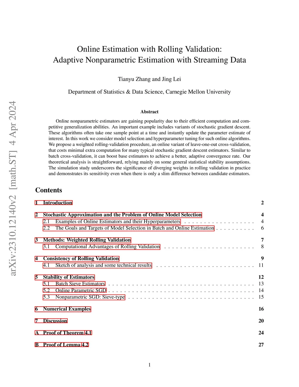 Online nonparametric estimators are gaining popularity due to their efficient computation and competitive generalization abilities. An important example includes variants of stochastic gradient descent. These algorithms often take one sample point at a time and incrementally update the parameter estimate of interest. In this work, we consider model selection/hyperparameter tuning for such online algorithms. We propose a weighted rolling validation procedure, an online variant of leave-one-out cross-validation, that costs minimal extra computation for many typical stochastic gradient descent estimators and maintains their online nature. Similar to batch cross-validation, it can boost base estimators to achieve better heuristic performance and adaptive convergence rate. Our analysis is straightforward, relying mainly on some general statistical stability assumptions. The simulation study underscores the significance of diverging weights in practice and demonstrates its favorable sensitivity even when there is only a slim difference between candidate estimators.