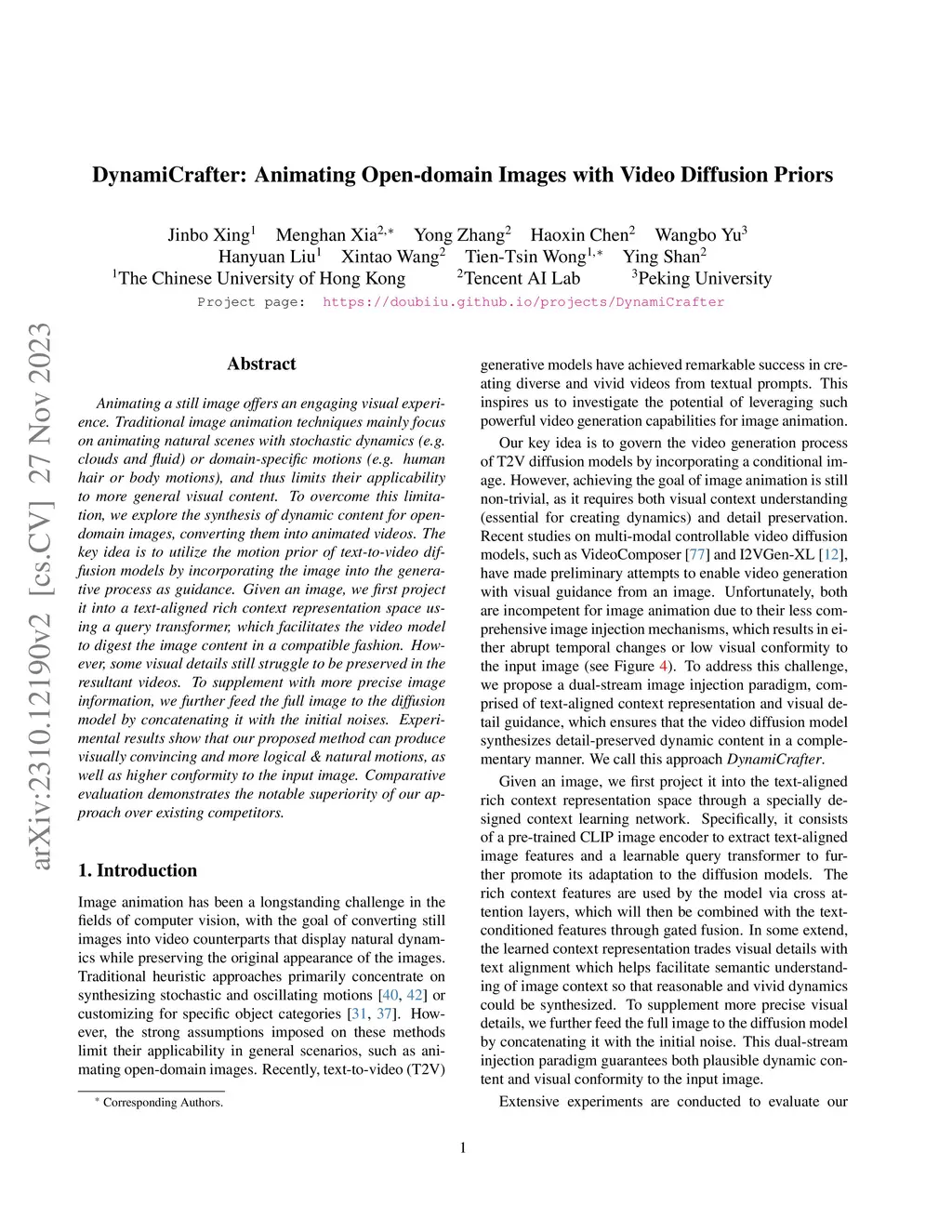 Animating a still image offers an engaging visual experience. Traditional image animation techniques mainly focus on animating natural scenes with stochastic dynamics (e.g. clouds and fluid) or domain-specific motions (e.g. human hair or body motions), and thus limits their applicability to more general visual content. To overcome this limitation, we explore the synthesis of dynamic content for open-domain images, converting them into animated videos. The key idea is to utilize the motion prior of text-to-video diffusion models by incorporating the image into the generative process as guidance. Given an image, we first project it into a text-aligned rich context representation space using a query transformer, which facilitates the video model to digest the image content in a compatible fashion. However, some visual details still struggle to be preserved in the resultant videos. To supplement with more precise image information, we further feed the full image to the diffusion model by concatenating it with the initial noises. Experimental results show that our proposed method can produce visually convincing and more logical & natural motions, as well as higher conformity to the input image. Comparative evaluation demonstrates the notable superiority of our approach over existing competitors.