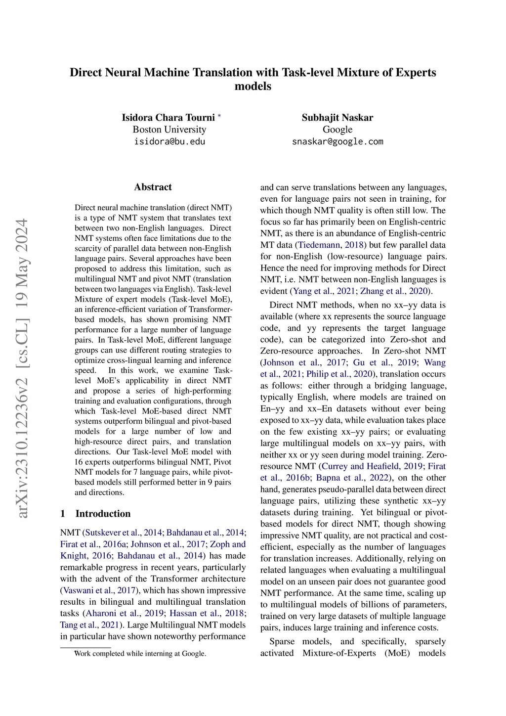 Direct Neural Machine Translation with Task-level Mixture of Experts
