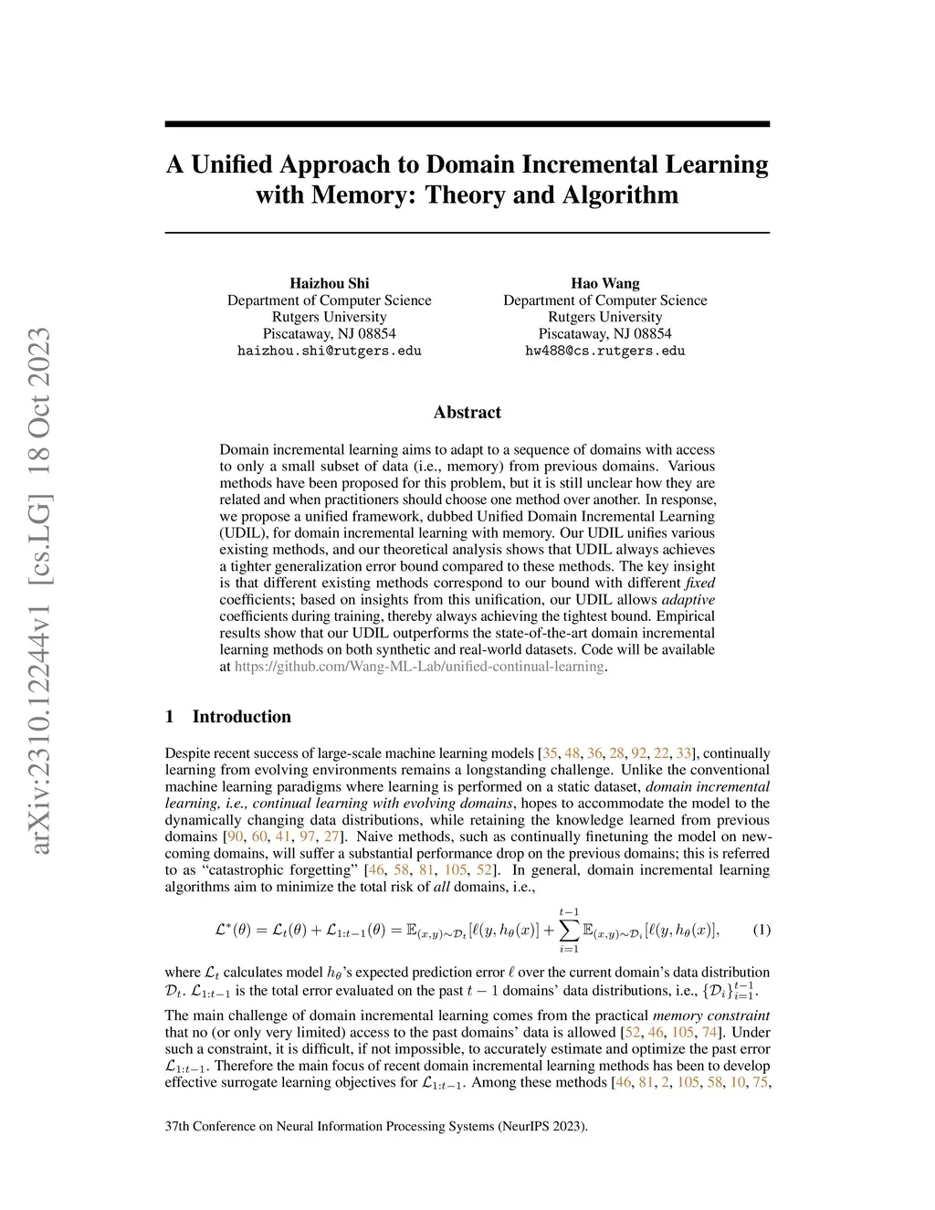 A Unified Approach to Domain Incremental Learning with Memory: Theory