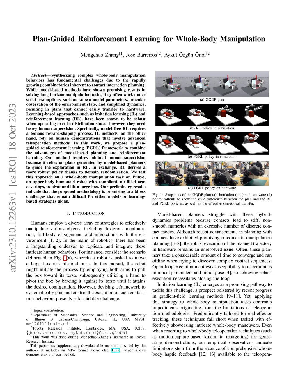 Synthesizing complex whole-body manipulation behaviors has fundamental challenges due to the rapidly growing combinatorics inherent to contact interaction planning. While model-based methods have shown promising results in solving long-horizon manipulation tasks, they often work under strict assumptions, such as known model parameters, oracular observation of the environment state, and simplified dynamics, resulting in plans that cannot easily transfer to hardware. Learning-based approaches, such as imitation learning (IL) and reinforcement learning (RL), have been shown to be robust when operating over in-distribution states; however, they need heavy human supervision. Specifically, model-free RL requires a tedious reward-shaping process. IL methods, on the other hand, rely on human demonstrations that involve advanced teleoperation methods. In this work, we propose a plan-guided reinforcement learning (PGRL) framework to combine the advantages of model-based planning and reinforcement learning. Our method requires minimal human supervision because it relies on plans generated by model-based planners to guide the exploration in RL. In exchange, RL derives a more robust policy thanks to domain randomization. We test this approach on a whole-body manipulation task on Punyo, an upper-body humanoid robot with compliant, air-filled arm coverings, to pivot and lift a large box. Our preliminary results indicate that the proposed methodology is promising to address challenges that remain difficult for either model- or learning-based strategies alone.