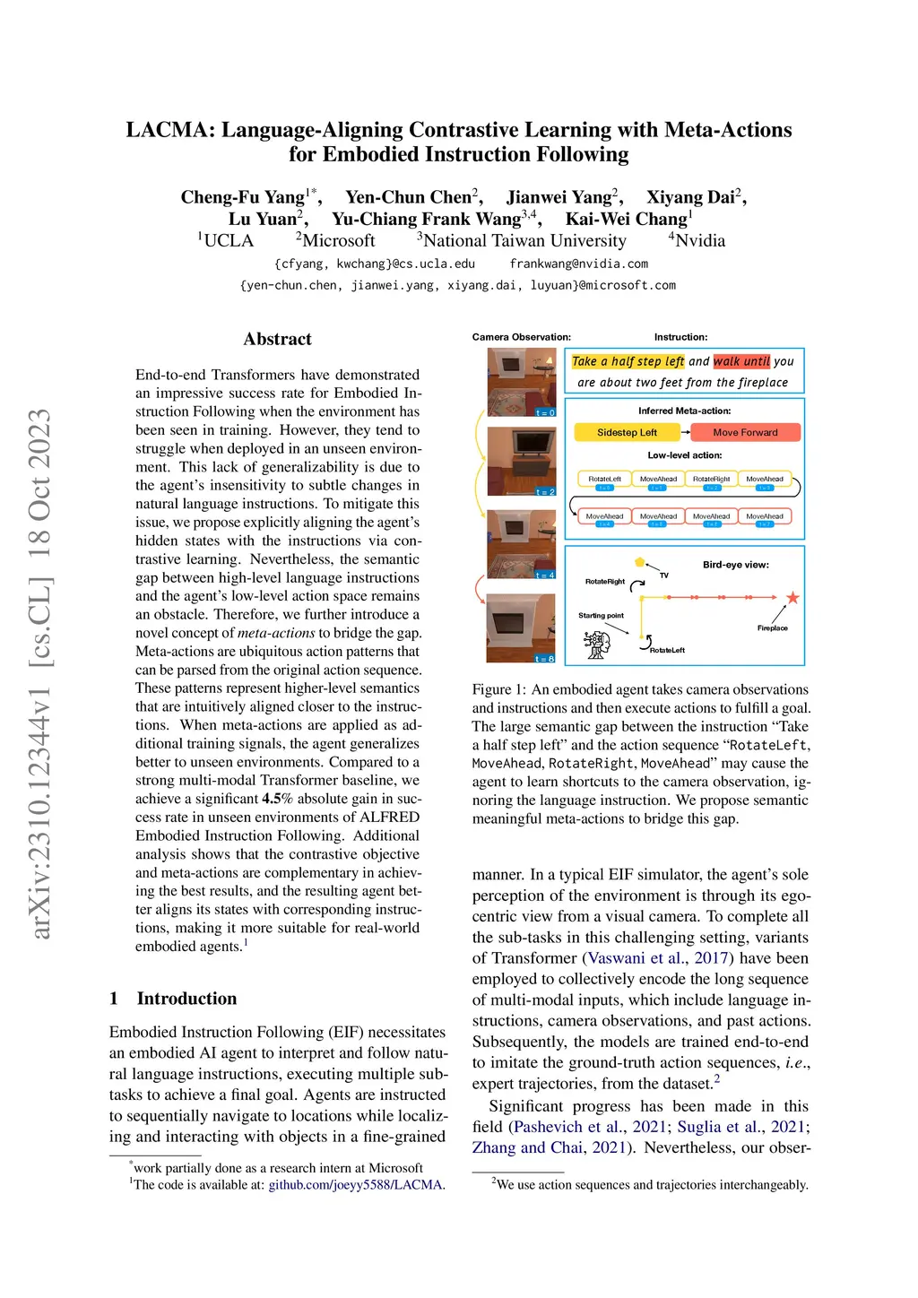 End-to-end Transformers have demonstrated an impressive success rate for Embodied Instruction Following when the environment has been seen in training. However, they tend to struggle when deployed in an unseen environment. This lack of generalizability is due to the agent's insensitivity to subtle changes in natural language instructions. To mitigate this issue, we propose explicitly aligning the agent's hidden states with the instructions via contrastive learning. Nevertheless, the semantic gap between high-level language instructions and the agent's low-level action space remains an obstacle. Therefore, we further introduce a novel concept of meta-actions to bridge the gap. Meta-actions are ubiquitous action patterns that can be parsed from the original action sequence. These patterns represent higher-level semantics that are intuitively aligned closer to the instructions. When meta-actions are applied as additional training signals, the agent generalizes better to unseen environments. Compared to a strong multi-modal Transformer baseline, we achieve a significant 4.5% absolute gain in success rate in unseen environments of ALFRED Embodied Instruction Following. Additional analysis shows that the contrastive objective and meta-actions are complementary in achieving the best results, and the resulting agent better aligns its states with corresponding instructions, making it more suitable for real-world embodied agents. The code is available at: https://github.com/joeyy5588/LACMA.