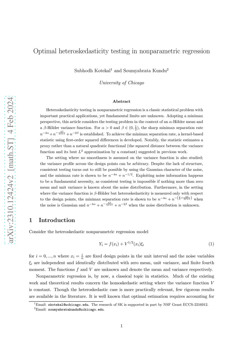 Heteroskedasticity testing in nonparametric regression is a classic statistical problem with important practical applications, yet fundamental limits are unknown. Adopting a minimax perspective, this article considers the testing problem in the context of an -H\"{o}lder mean and a -H\"{o}lder variance function. For and , the sharp minimax separation rate is established. To achieve the minimax separation rate, a kernel-based statistic using first-order squared differences is developed. Notably, the statistic estimates a proxy rather than a natural quadratic functional (the squared distance between the variance function and its best approximation by a constant) suggested in previous work. The setting where no smoothness is assumed on the variance function is also studied; the variance profile across the design points can be arbitrary. Despite the lack of structure, consistent testing turns out to still be possible by using the Gaussian character of the noise, and the minimax rate is shown to be . Exploiting noise information happens to be a fundamental necessity as consistent testing is impossible if nothing more than zero mean and unit variance is known about the noise distribution. Furthermore, in the setting where the variance function is -H\"{o}lder but heteroskedasticity is measured only with respect to the design points, the minimax separation rate is shown to be when the noise is Gaussian and when the noise distribution is unknown.