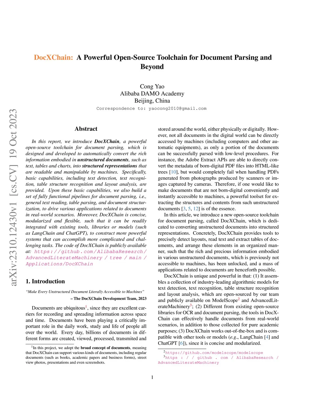 In this report, we introduce DocXChain, a powerful open-source toolchain for document parsing, which is designed and developed to automatically convert the rich information embodied in unstructured documents, such as text, tables and charts, into structured representations that are readable and manipulable by machines. Specifically, basic capabilities, including text detection, text recognition, table structure recognition and layout analysis, are provided. Upon these basic capabilities, we also build a set of fully functional pipelines for document parsing, i.e., general text reading, table parsing, and document structurization, to drive various applications related to documents in real-world scenarios. Moreover, DocXChain is concise, modularized and flexible, such that it can be readily integrated with existing tools, libraries or models (such as LangChain and ChatGPT), to construct more powerful systems that can accomplish more complicated and challenging tasks. The code of DocXChain is publicly available at:~\url{https://github.com/AlibabaResearch/AdvancedLiterateMachinery/tree/main/Applications/DocXChain}
