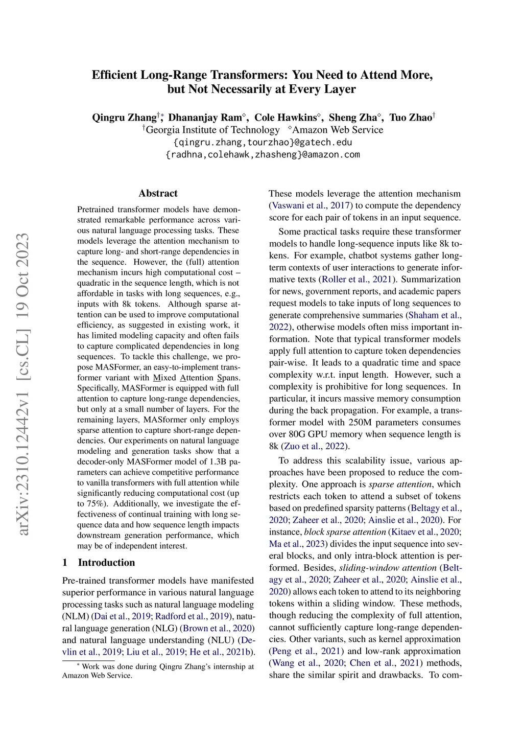 Pretrained transformer models have demonstrated remarkable performance across various natural language processing tasks. These models leverage the attention mechanism to capture long- and short-range dependencies in the sequence. However, the (full) attention mechanism incurs high computational cost - quadratic in the sequence length, which is not affordable in tasks with long sequences, e.g., inputs with 8k tokens. Although sparse attention can be used to improve computational efficiency, as suggested in existing work, it has limited modeling capacity and often fails to capture complicated dependencies in long sequences. To tackle this challenge, we propose MASFormer, an easy-to-implement transformer variant with Mixed Attention Spans. Specifically, MASFormer is equipped with full attention to capture long-range dependencies, but only at a small number of layers. For the remaining layers, MASformer only employs sparse attention to capture short-range dependencies. Our experiments on natural language modeling and generation tasks show that a decoder-only MASFormer model of 1.3B parameters can achieve competitive performance to vanilla transformers with full attention while significantly reducing computational cost (up to 75%). Additionally, we investigate the effectiveness of continual training with long sequence data and how sequence length impacts downstream generation performance, which may be of independent interest.
