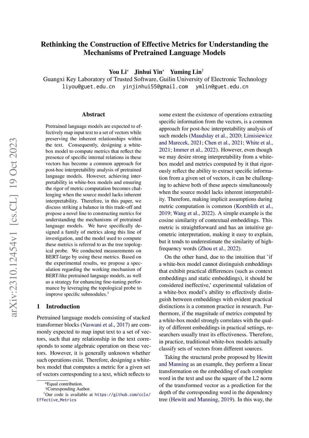 Pretrained language models are expected to effectively map input text to a set of vectors while preserving the inherent relationships within the text. Consequently, designing a white-box model to compute metrics that reflect the presence of specific internal relations in these vectors has become a common approach for post-hoc interpretability analysis of pretrained language models. However, achieving interpretability in white-box models and ensuring the rigor of metric computation becomes challenging when the source model lacks inherent interpretability. Therefore, in this paper, we discuss striking a balance in this trade-off and propose a novel line to constructing metrics for understanding the mechanisms of pretrained language models. We have specifically designed a family of metrics along this line of investigation, and the model used to compute these metrics is referred to as the tree topological probe. We conducted measurements on BERT-large by using these metrics. Based on the experimental results, we propose a speculation regarding the working mechanism of BERT-like pretrained language models, as well as a strategy for enhancing fine-tuning performance by leveraging the topological probe to improve specific submodules.