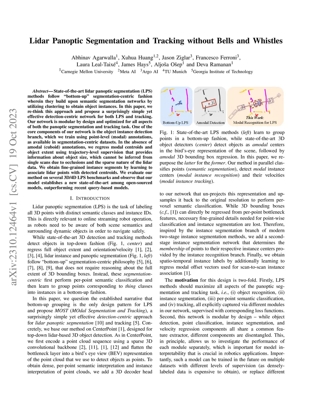 State-of-the-art lidar panoptic segmentation (LPS) methods follow bottom-up segmentation-centric fashion wherein they build upon semantic segmentation networks by utilizing clustering to obtain object instances. In this paper, we re-think this approach and propose a surprisingly simple yet effective detection-centric network for both LPS and tracking. Our network is modular by design and optimized for all aspects of both the panoptic segmentation and tracking task. One of the core components of our network is the object instance detection branch, which we train using point-level (modal) annotations, as available in segmentation-centric datasets. In the absence of amodal (cuboid) annotations, we regress modal centroids and object extent using trajectory-level supervision that provides information about object size, which cannot be inferred from single scans due to occlusions and the sparse nature of the lidar data. We obtain fine-grained instance segments by learning to associate lidar points with detected centroids. We evaluate our method on several 3D/4D LPS benchmarks and observe that our model establishes a new state-of-the-art among open-sourced models, outperforming recent query-based models.