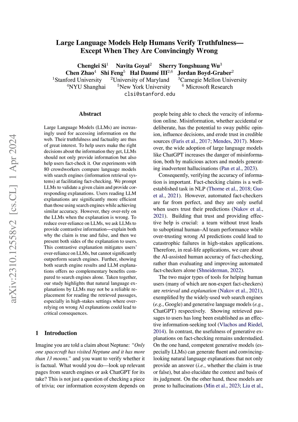 Large Language Models (LLMs) are increasingly used for accessing information on the web. Their truthfulness and factuality are thus of great interest. To help users make the right decisions about the information they get, LLMs should not only provide information but also help users fact-check it. Our experiments with 80 crowdworkers compare language models with search engines (information retrieval systems) at facilitating fact-checking. We prompt LLMs to validate a given claim and provide corresponding explanations. Users reading LLM explanations are significantly more efficient than those using search engines while achieving similar accuracy. However, they over-rely on the LLMs when the explanation is wrong. To reduce over-reliance on LLMs, we ask LLMs to provide contrastive information - explain both why the claim is true and false, and then we present both sides of the explanation to users. This contrastive explanation mitigates users' over-reliance on LLMs, but cannot significantly outperform search engines. Further, showing both search engine results and LLM explanations offers no complementary benefits compared to search engines alone. Taken together, our study highlights that natural language explanations by LLMs may not be a reliable replacement for reading the retrieved passages, especially in high-stakes settings where over-relying on wrong AI explanations could lead to critical consequences.
