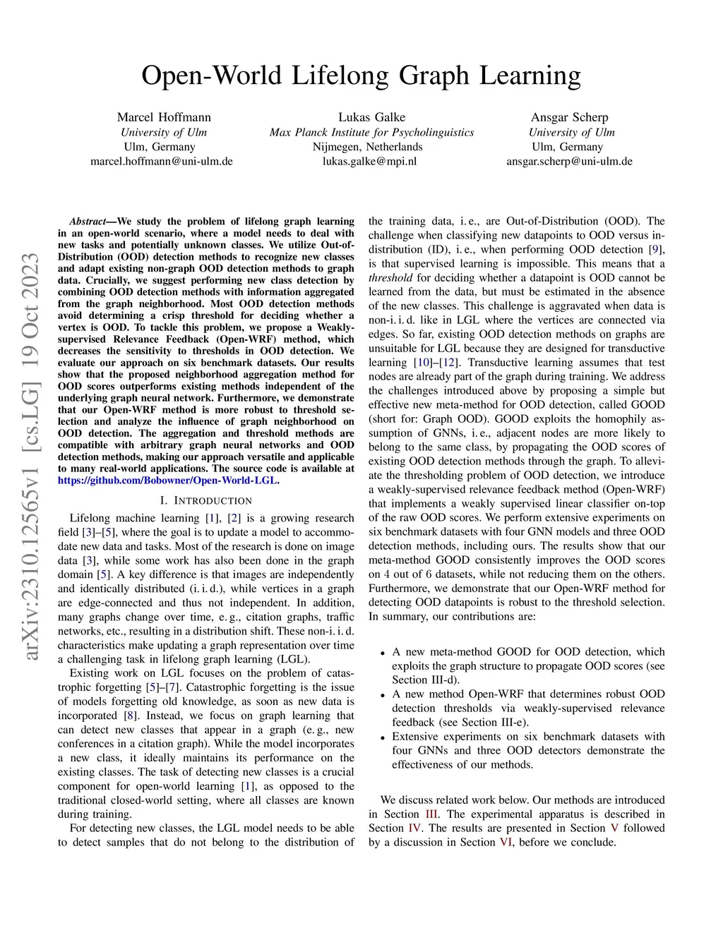 We study the problem of lifelong graph learning in an open-world scenario, where a model needs to deal with new tasks and potentially unknown classes. We utilize Out-of-Distribution (OOD) detection methods to recognize new classes and adapt existing non-graph OOD detection methods to graph data. Crucially, we suggest performing new class detection by combining OOD detection methods with information aggregated from the graph neighborhood. Most OOD detection methods avoid determining a crisp threshold for deciding whether a vertex is OOD. To tackle this problem, we propose a Weakly-supervised Relevance Feedback (Open-WRF) method, which decreases the sensitivity to thresholds in OOD detection. We evaluate our approach on six benchmark datasets. Our results show that the proposed neighborhood aggregation method for OOD scores outperforms existing methods independent of the underlying graph neural network. Furthermore, we demonstrate that our Open-WRF method is more robust to threshold selection and analyze the influence of graph neighborhood on OOD detection. The aggregation and threshold methods are compatible with arbitrary graph neural networks and OOD detection methods, making our approach versatile and applicable to many real-world applications.
