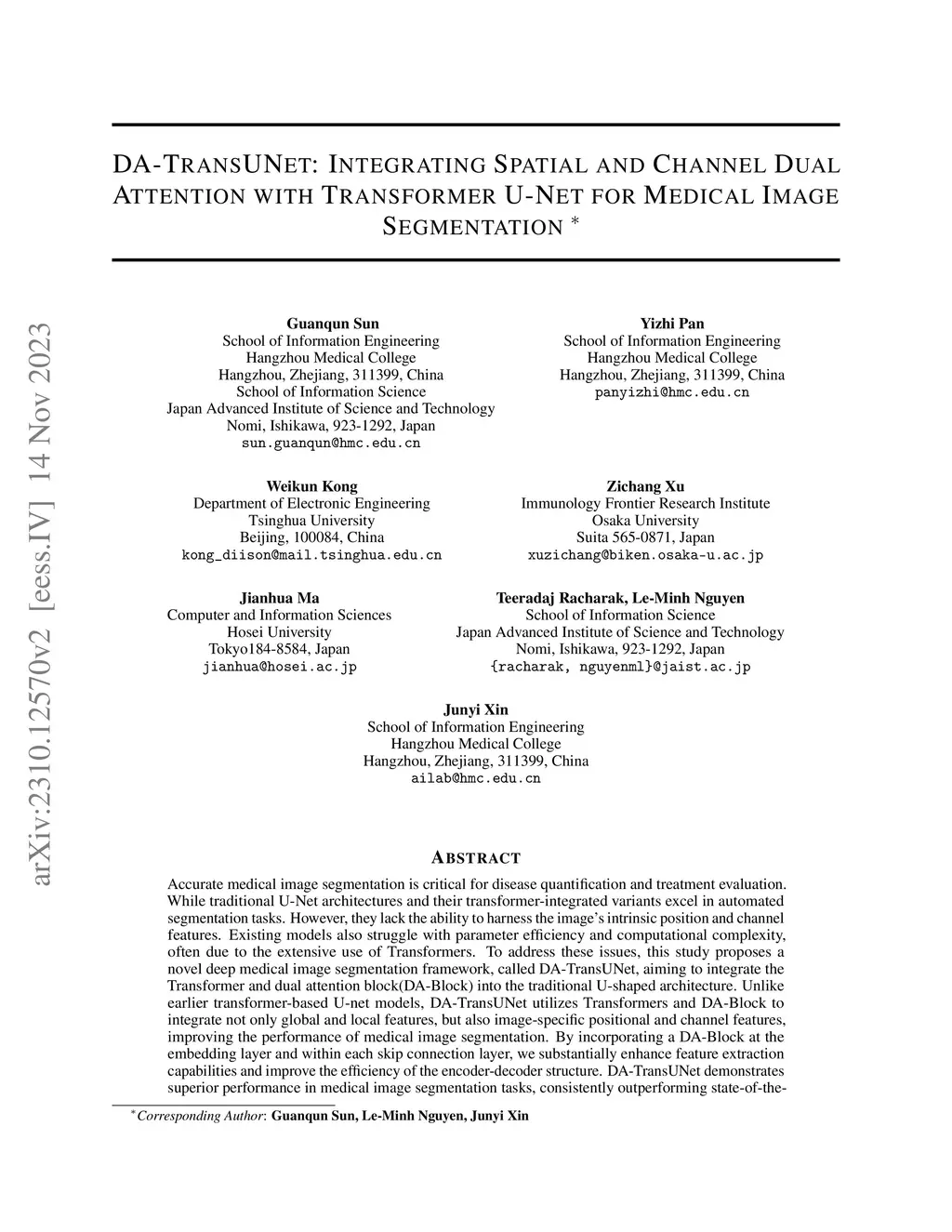Accurate medical image segmentation is critical for disease quantification and treatment evaluation. While traditional Unet architectures and their transformer-integrated variants excel in automated segmentation tasks. However, they lack the ability to harness the intrinsic position and channel features of image. Existing models also struggle with parameter efficiency and computational complexity, often due to the extensive use of Transformers. To address these issues, this study proposes a novel deep medical image segmentation framework, called DA-TransUNet, aiming to integrate the Transformer and dual attention block(DA-Block) into the traditional U-shaped architecture. Unlike earlier transformer-based U-net models, DA-TransUNet utilizes Transformers and DA-Block to integrate not only global and local features, but also image-specific positional and channel features, improving the performance of medical image segmentation. By incorporating a DA-Block at the embedding layer and within each skip connection layer, we substantially enhance feature extraction capabilities and improve the efficiency of the encoder-decoder structure. DA-TransUNet demonstrates superior performance in medical image segmentation tasks, consistently outperforming state-of-the-art techniques across multiple datasets. In summary, DA-TransUNet offers a significant advancement in medical image segmentation, providing an effective and powerful alternative to existing techniques. Our architecture stands out for its ability to improve segmentation accuracy, thereby advancing the field of automated medical image diagnostics. The codes and parameters of our model will be publicly available at https://github.com/SUN-1024/DA-TransUnet.