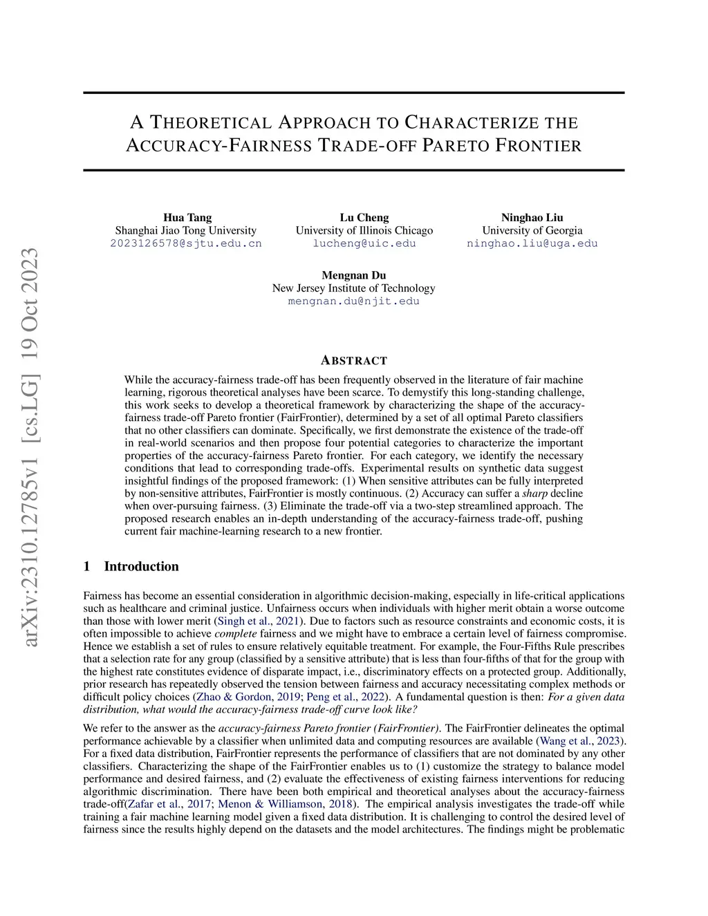 While the accuracy-fairness trade-off has been frequently observed in the literature of fair machine learning, rigorous theoretical analyses have been scarce. To demystify this long-standing challenge, this work seeks to develop a theoretical framework by characterizing the shape of the accuracy-fairness trade-off Pareto frontier (FairFrontier), determined by a set of all optimal Pareto classifiers that no other classifiers can dominate. Specifically, we first demonstrate the existence of the trade-off in real-world scenarios and then propose four potential categories to characterize the important properties of the accuracy-fairness Pareto frontier. For each category, we identify the necessary conditions that lead to corresponding trade-offs. Experimental results on synthetic data suggest insightful findings of the proposed framework: (1) When sensitive attributes can be fully interpreted by non-sensitive attributes, FairFrontier is mostly continuous. (2) Accuracy can suffer a \textit{sharp} decline when over-pursuing fairness. (3) Eliminate the trade-off via a two-step streamlined approach. The proposed research enables an in-depth understanding of the accuracy-fairness trade-off, pushing current fair machine-learning research to a new frontier.
