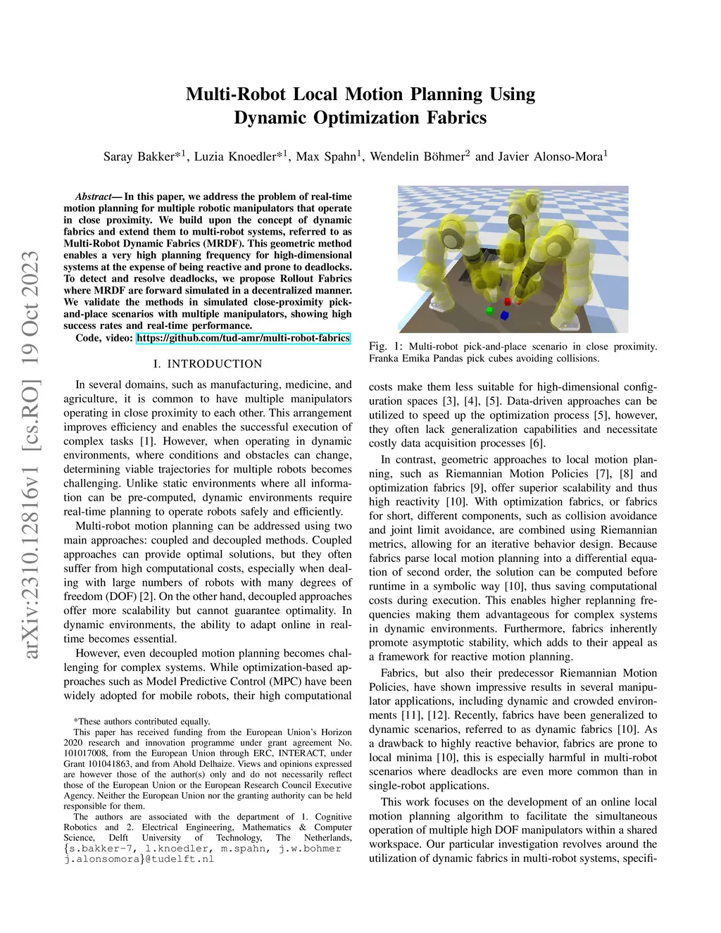 In this paper, we address the problem of real-time motion planning for multiple robotic manipulators that operate in close proximity. We build upon the concept of dynamic fabrics and extend them to multi-robot systems, referred to as Multi-Robot Dynamic Fabrics (MRDF). This geometric method enables a very high planning frequency for high-dimensional systems at the expense of being reactive and prone to deadlocks. To detect and resolve deadlocks, we propose Rollout Fabrics where MRDF are forward simulated in a decentralized manner. We validate the methods in simulated close-proximity pick-and-place scenarios with multiple manipulators, showing high success rates and real-time performance.
