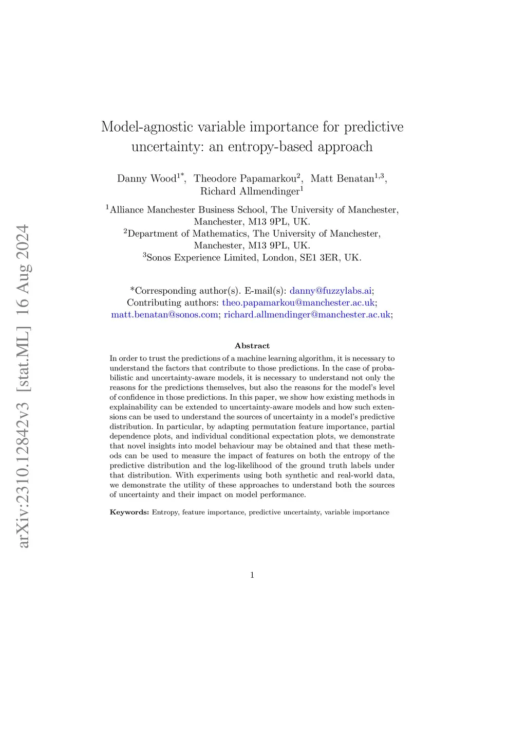 In order to trust the predictions of a machine learning algorithm, it is necessary to understand the factors that contribute to those predictions. In the case of probabilistic and uncertainty-aware models, it is necessary to understand not only the reasons for the predictions themselves, but also the reasons for the model's level of confidence in those predictions. In this paper, we show how existing methods in explainability can be extended to uncertainty-aware models and how such extensions can be used to understand the sources of uncertainty in a model's predictive distribution. In particular, by adapting permutation feature importance, partial dependence plots, and individual conditional expectation plots, we demonstrate that novel insights into model behaviour may be obtained and that these methods can be used to measure the impact of features on both the entropy of the predictive distribution and the log-likelihood of the ground truth labels under that distribution. With experiments using both synthetic and real-world data, we demonstrate the utility of these approaches to understand both the sources of uncertainty and their impact on model performance.
