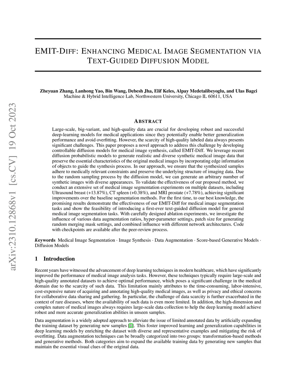 Large-scale, big-variant, and high-quality data are crucial for developing robust and successful deep-learning models for medical applications since they potentially enable better generalization performance and avoid overfitting. However, the scarcity of high-quality labeled data always presents significant challenges. This paper proposes a novel approach to address this challenge by developing controllable diffusion models for medical image synthesis, called EMIT-Diff. We leverage recent diffusion probabilistic models to generate realistic and diverse synthetic medical image data that preserve the essential characteristics of the original medical images by incorporating edge information of objects to guide the synthesis process. In our approach, we ensure that the synthesized samples adhere to medically relevant constraints and preserve the underlying structure of imaging data. Due to the random sampling process by the diffusion model, we can generate an arbitrary number of synthetic images with diverse appearances. To validate the effectiveness of our proposed method, we conduct an extensive set of medical image segmentation experiments on multiple datasets, including Ultrasound breast (+13.87%), CT spleen (+0.38%), and MRI prostate (+7.78%), achieving significant improvements over the baseline segmentation methods. For the first time, to our best knowledge, the promising results demonstrate the effectiveness of our EMIT-Diff for medical image segmentation tasks and show the feasibility of introducing a first-ever text-guided diffusion model for general medical image segmentation tasks. With carefully designed ablation experiments, we investigate the influence of various data augmentation ratios, hyper-parameter settings, patch size for generating random merging mask settings, and combined influence with different network architectures.