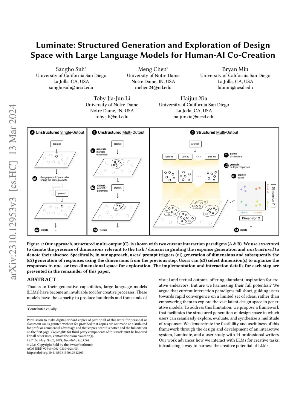 Thanks to their generative capabilities, large language models (LLMs) have become an invaluable tool for creative processes. These models have the capacity to produce hundreds and thousands of visual and textual outputs, offering abundant inspiration for creative endeavors. But are we harnessing their full potential? We argue that current interaction paradigms fall short, guiding users towards rapid convergence on a limited set of ideas, rather than empowering them to explore the vast latent design space in generative models. To address this limitation, we propose a framework that facilitates the structured generation of design space in which users can seamlessly explore, evaluate, and synthesize a multitude of responses. We demonstrate the feasibility and usefulness of this framework through the design and development of an interactive system, Luminate, and a user study with 14 professional writers. Our work advances how we interact with LLMs for creative tasks, introducing a way to harness the creative potential of LLMs.