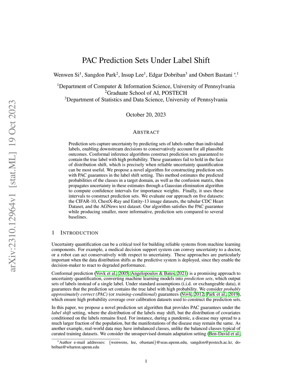 Prediction sets capture uncertainty by predicting sets of labels rather than individual labels, enabling downstream decisions to conservatively account for all plausible outcomes. Conformal inference algorithms construct prediction sets guaranteed to contain the true label with high probability. These guarantees fail to hold in the face of distribution shift, which is precisely when reliable uncertainty quantification can be most useful. We propose a novel algorithm for constructing prediction sets with PAC guarantees in the label shift setting. This method estimates the predicted probabilities of the classes in a target domain, as well as the confusion matrix, then propagates uncertainty in these estimates through a Gaussian elimination algorithm to compute confidence intervals for importance weights. Finally, it uses these intervals to construct prediction sets. We evaluate our approach on five datasets: the CIFAR-10, ChestX-Ray and Entity-13 image datasets, the tabular CDC Heart dataset, and the AGNews text dataset. Our algorithm satisfies the PAC guarantee while producing smaller, more informative, prediction sets compared to several baselines.